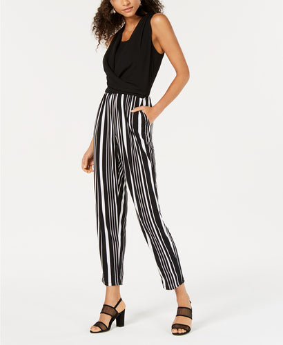 Bar III Women's Elegant Draped-Neck Striped Jumpsuit, Black, XXL