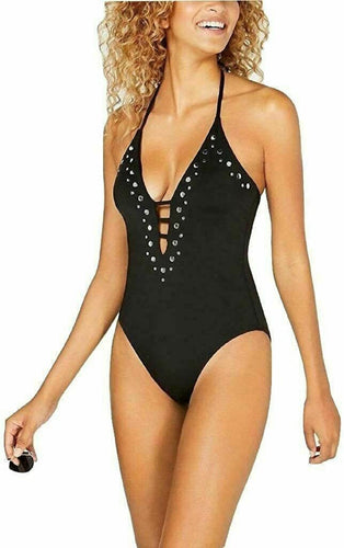 Bar III Women's Embellished Plunging One Piece Swimsuit, Black, M