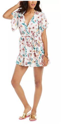 Miken Women's Clay Tropical Printed Wrap Cover-Up Dress, White, XS