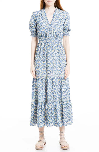 Max Studio Women's V-Neck Puff Sleeve Floral Tiered Dress, Blue, XS