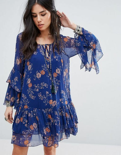 Free People Women's Floral Frill Tiered Swing Mini Dress, Blue, S