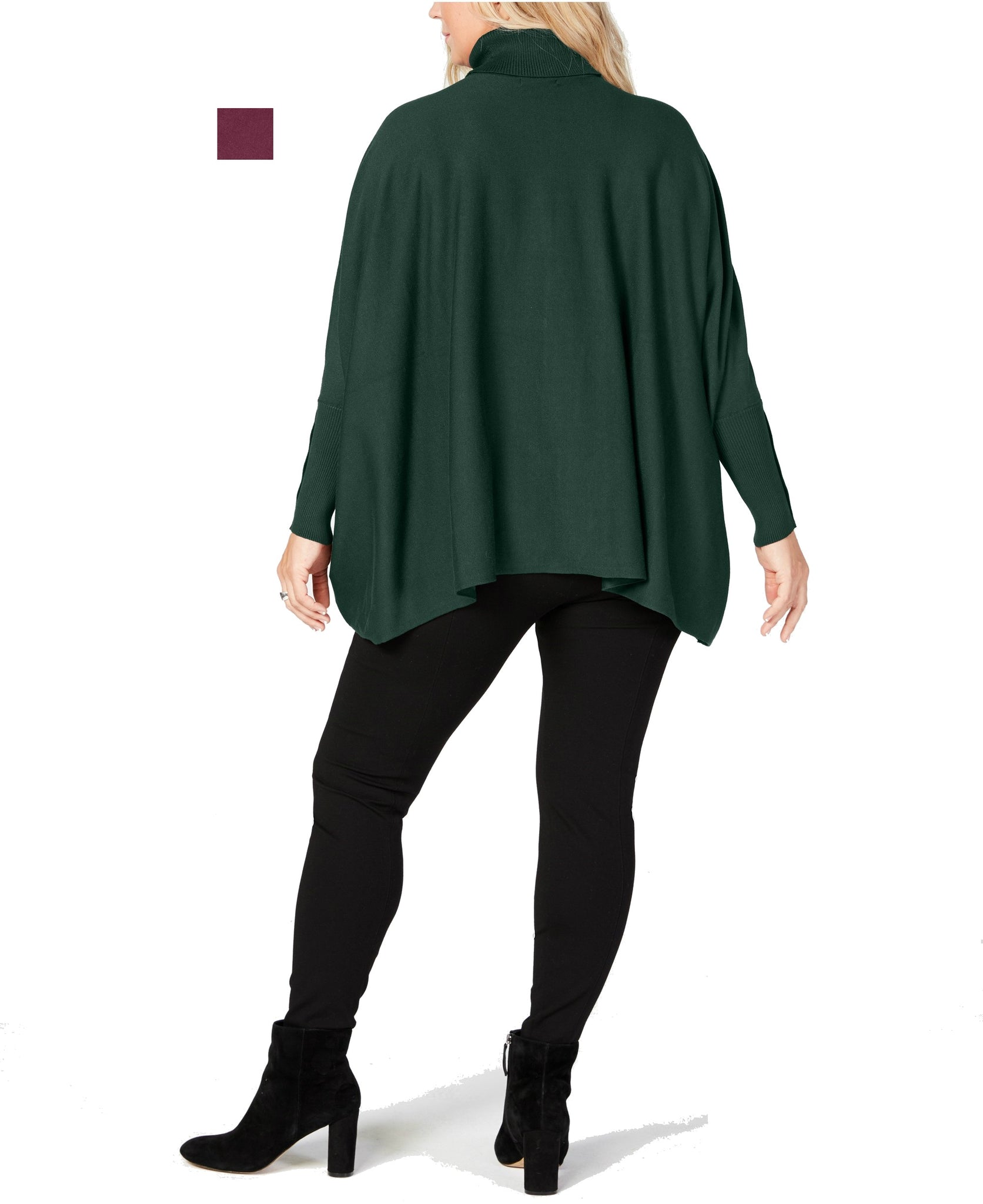 Flowing down from a cozy turtleneck, this Alfani plus size sweater flatters every inch to its handkerchief hem. Its roomy poncho sleeves feature cute button accents.