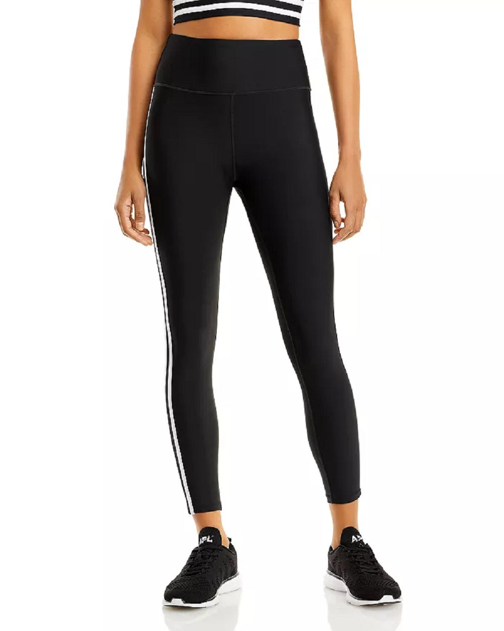 Seamed top-edge elastic waistband for secure hold; Small centerback pocket for small personal items; Medium impact; Stripe detailing down the sides; Interlock fabrication moisture-wicking material.