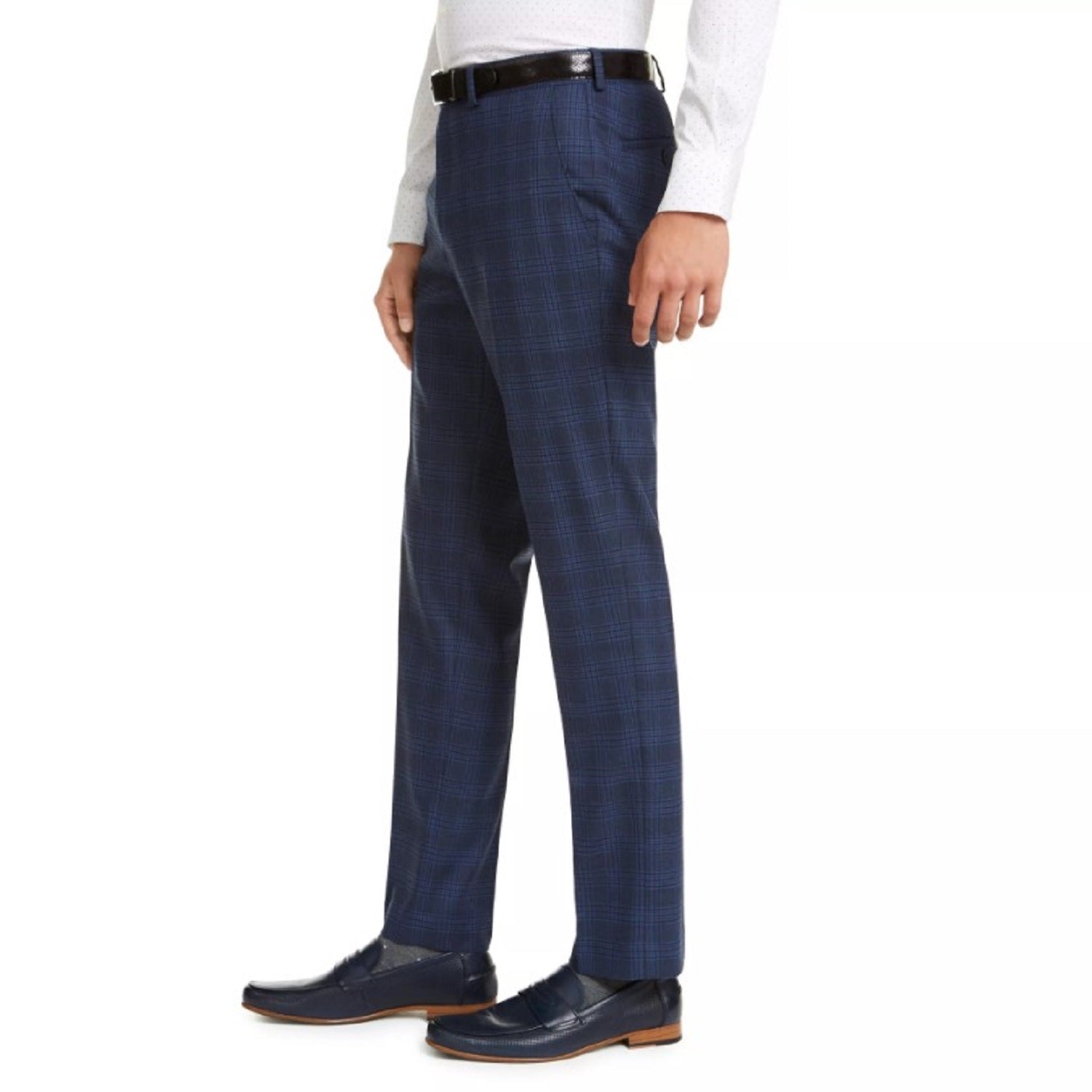 Step up your sophisticated style with the refined slim fit and attention-grabbing plaid of these blue suit pants from Bar III.