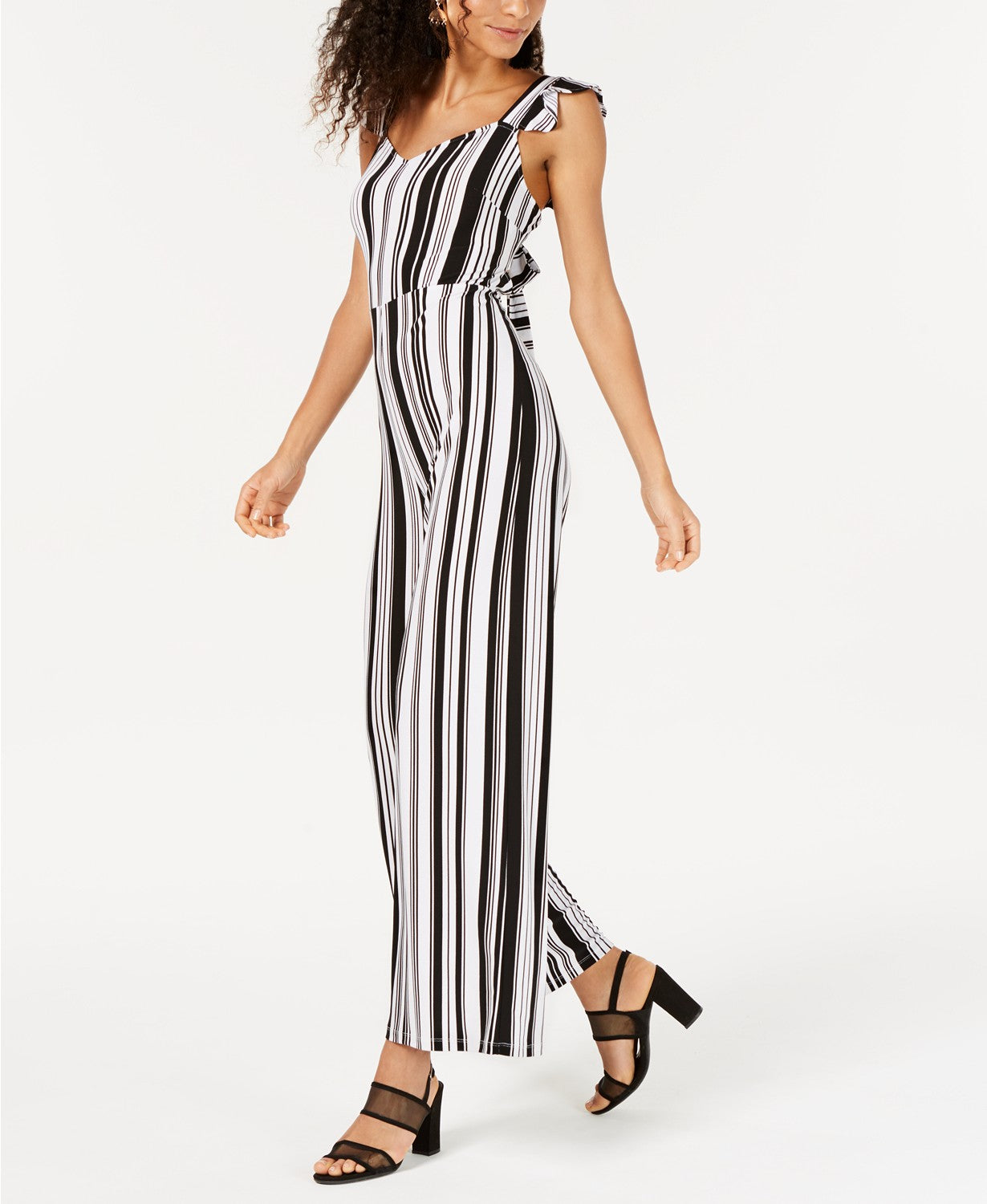 A bow-tied back adds an extra-cute twist to this Bar III stretch jumpsuit in bold and slimming stripes.