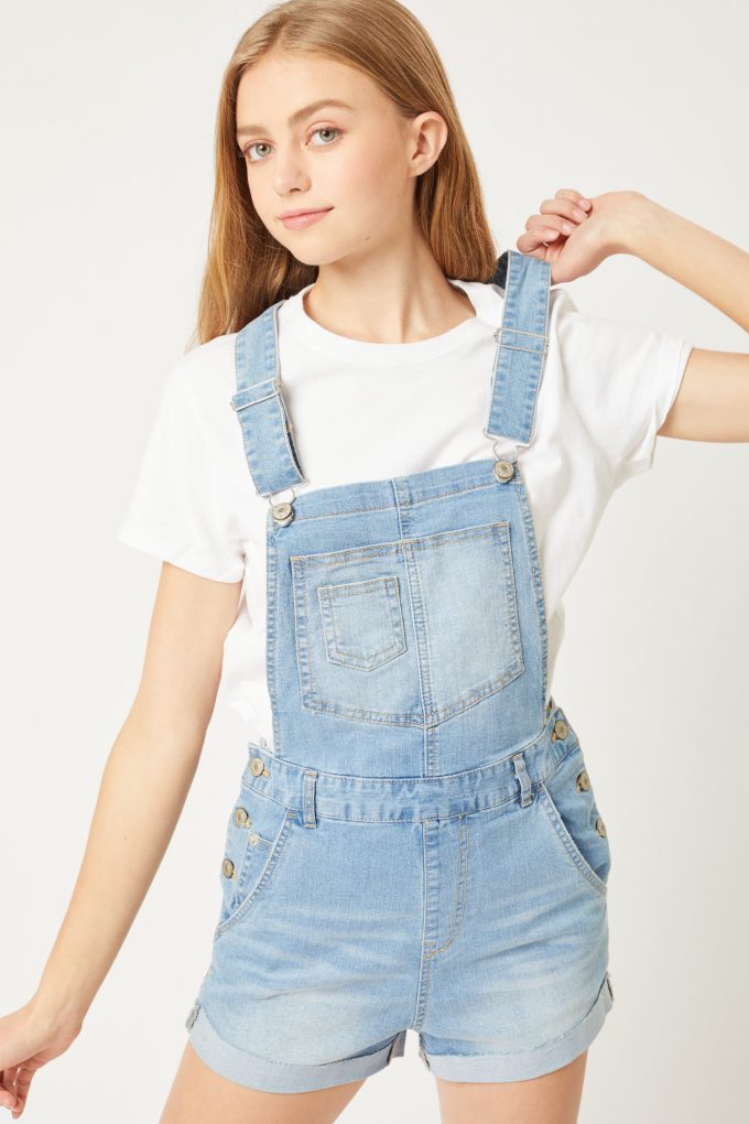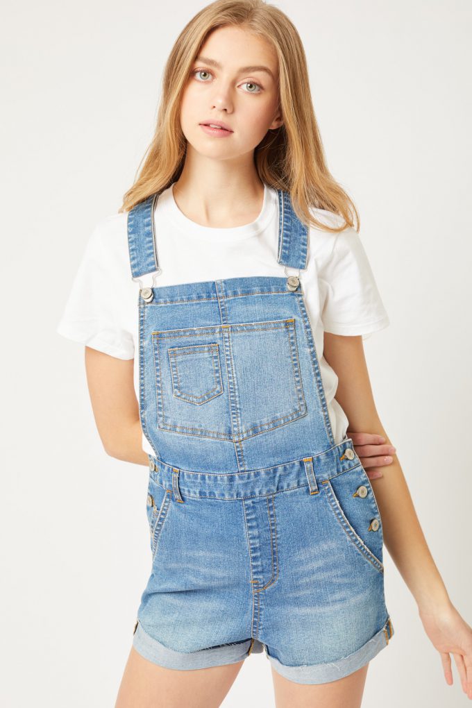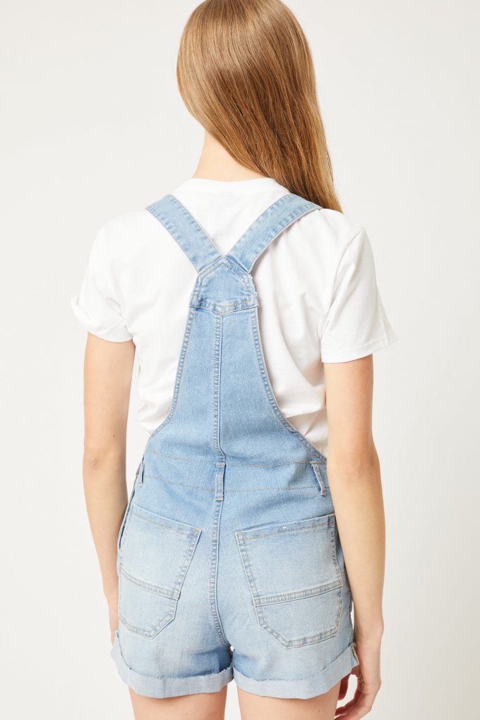 Distressed Rolled Hem Cotton Denim Overall Shorts