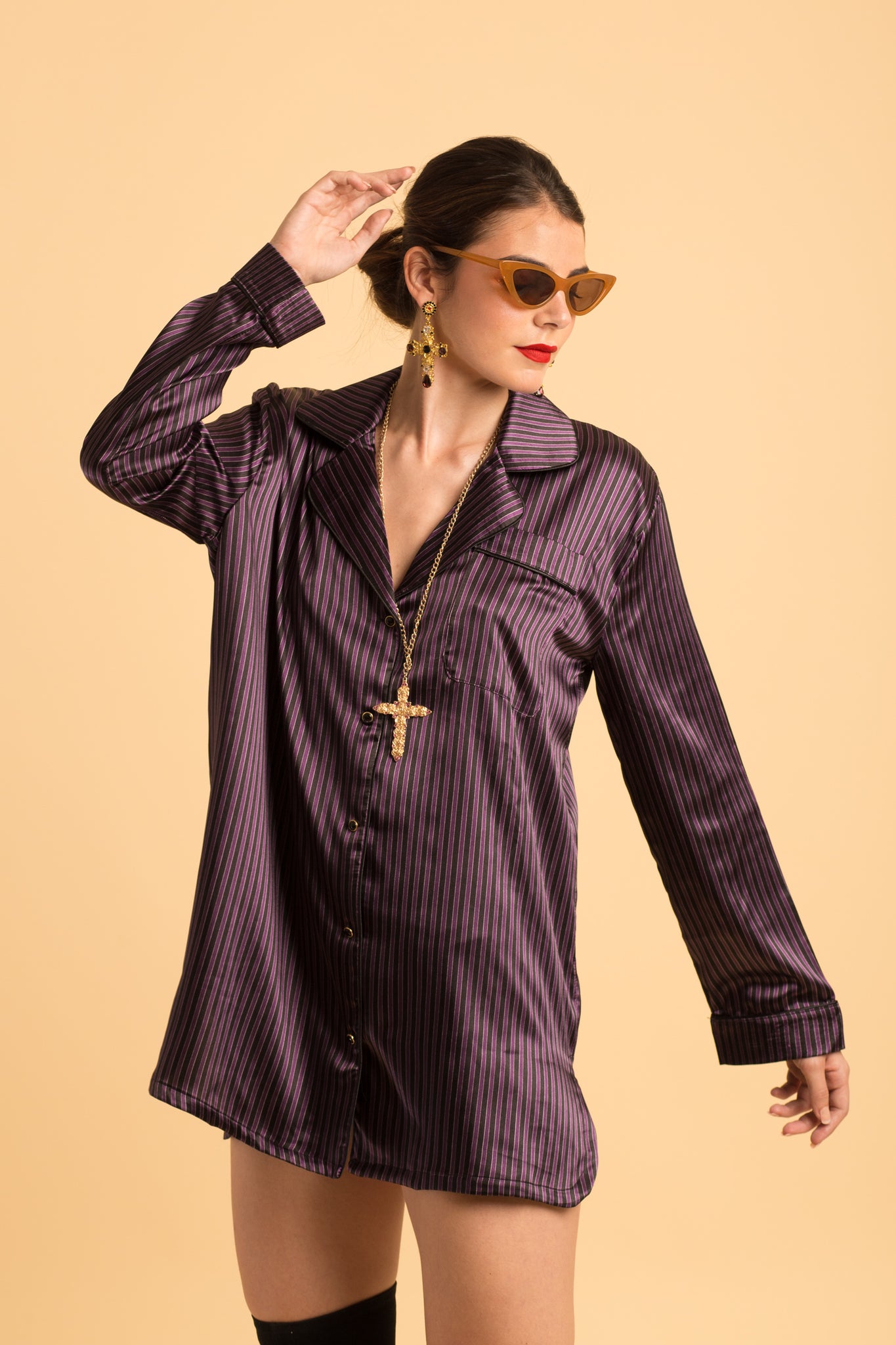 Long oversized purple and black stripped shirt dress with a collar and long sleeves. Featuring an A-line silhouette and metal buttons fastening in the front with side pocket.Length of the dress 1,72cm /Model tall 1,74cm Wears size S