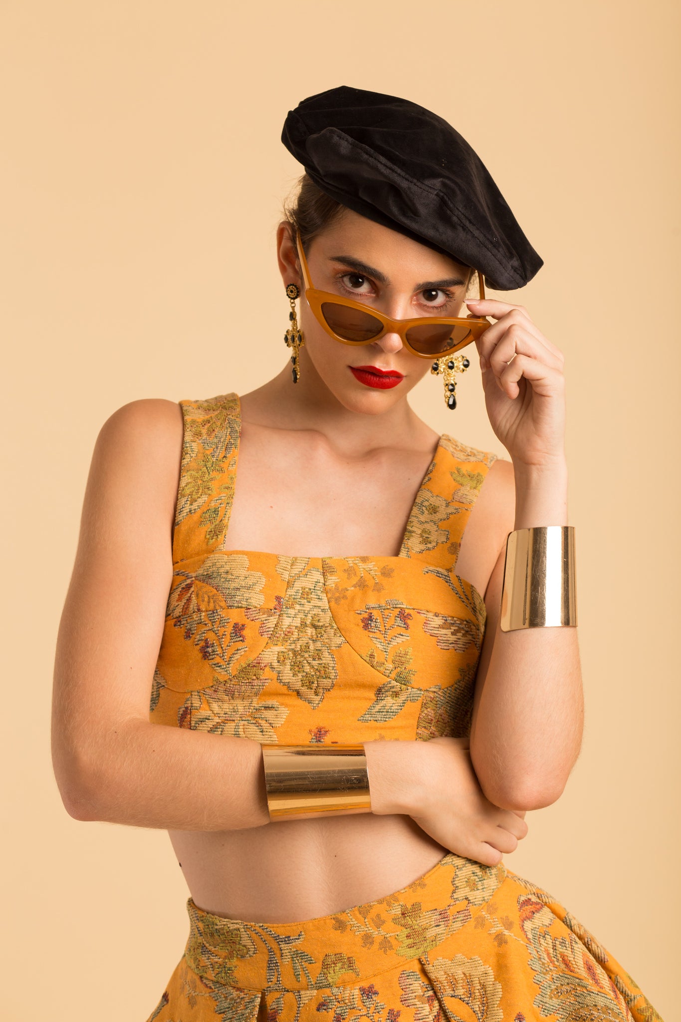 Yellow tapestry printed heart shape crop top with straps. Features draped detailing and back lace fastening. Lined interior with contrast printed fabric.Body length 17cm / Model tall 1,74cm Wears size S
