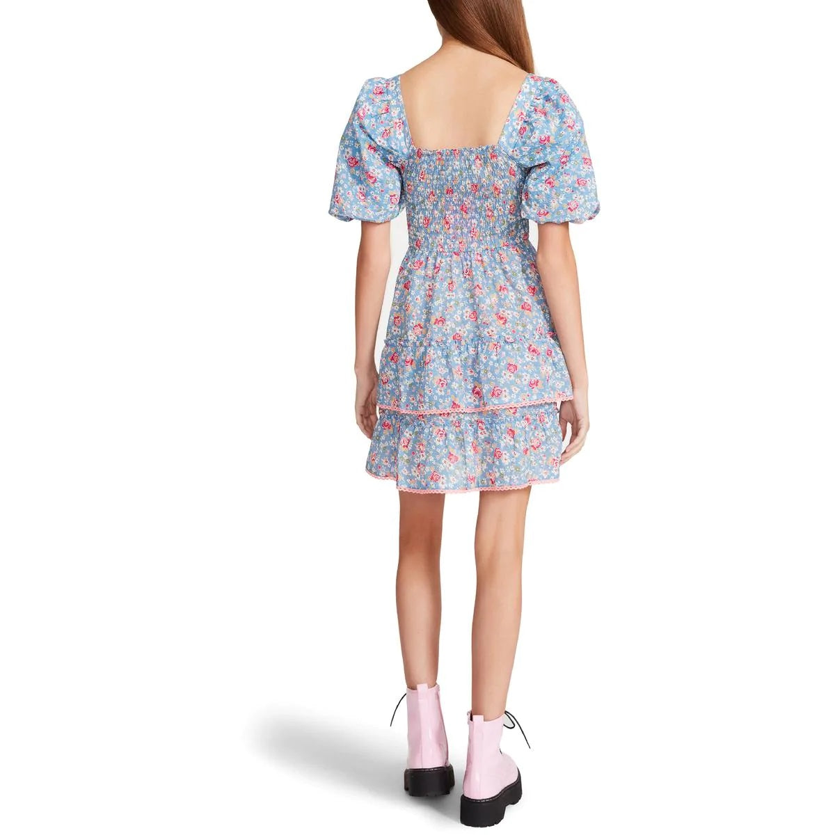 Fall in love with the Cottage Floral Dress by Betsey Johnson. Made of 100% Cotton, it features a square neck, puff sleeves and all-over floral print. This dress has a hook and eye closure detail on front bodice and smocking on the back for comfortable fit. This mini dress is available in small, medium, large, and extra large sizes.