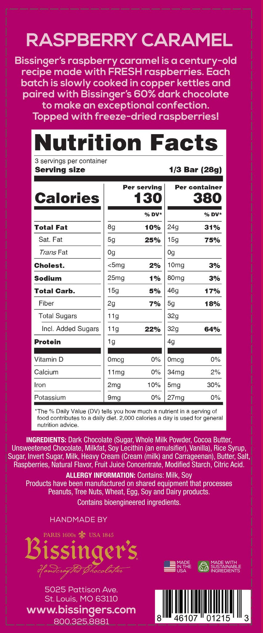 NEW! Bissinger's raspberry caramel is a century-old recipe made with FRESH raspberries. Each batch is slowly cooked in copper kettles and paired with Bissinger's 60% dark chocolate to make an exceptional confection. Topped with freeze-dried raspberries!