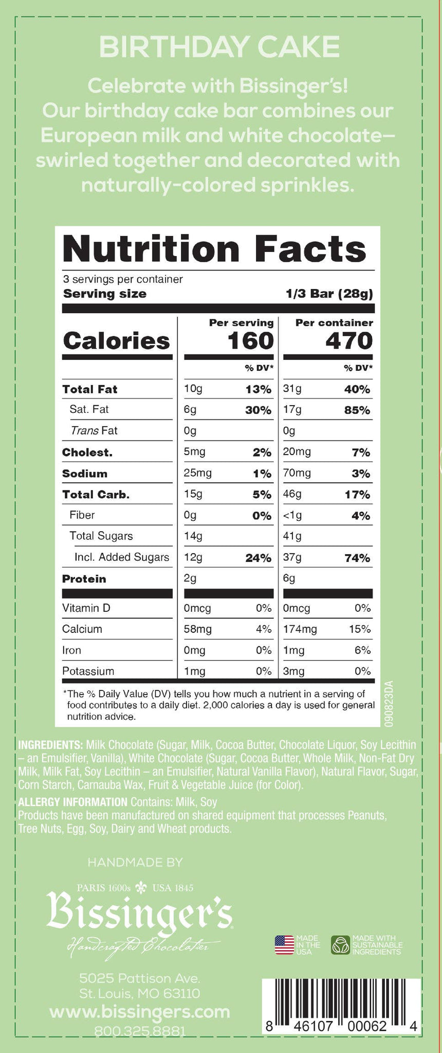 Celebrate with Bissinger's! Our Birthday Cake Bar combines our European milk and white chocolate - swirled together and decorated with naturally colored sprinkles! CASE PACK: 12 3 OZ