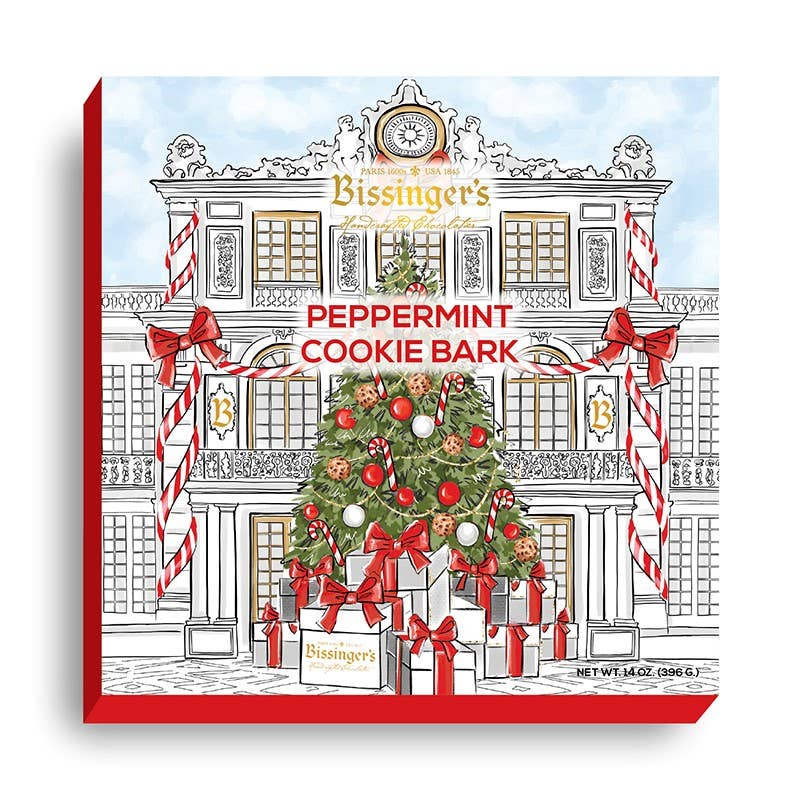 A crunchy and delicious upgrade to this classic holiday treat - Bissinger's 60% Dark Chocolate & White Chocolate are swirled together, infused with natural peppermint oil and topped with natural candy cane pieces and sandwich cookies.