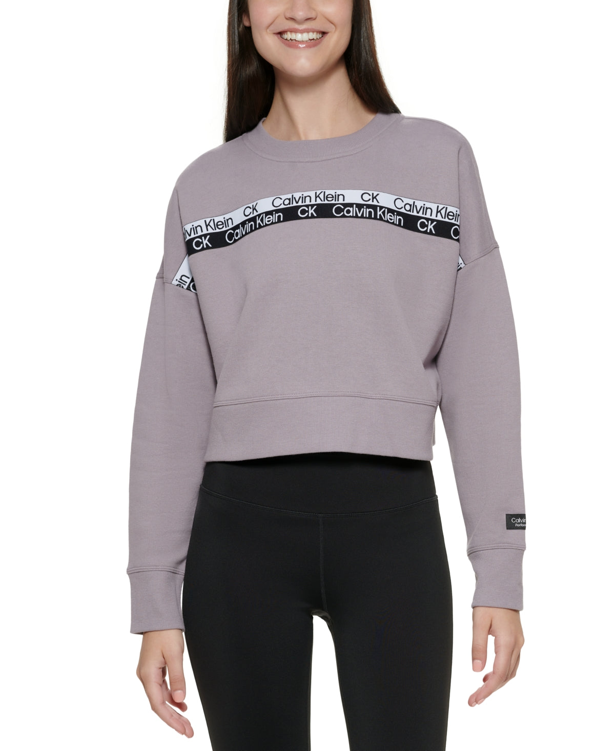 A signature logo, printed twice with a positive/negative splice, accents the cute cropped shape of this cozy fleece pullover from Calvin Klein Performance.