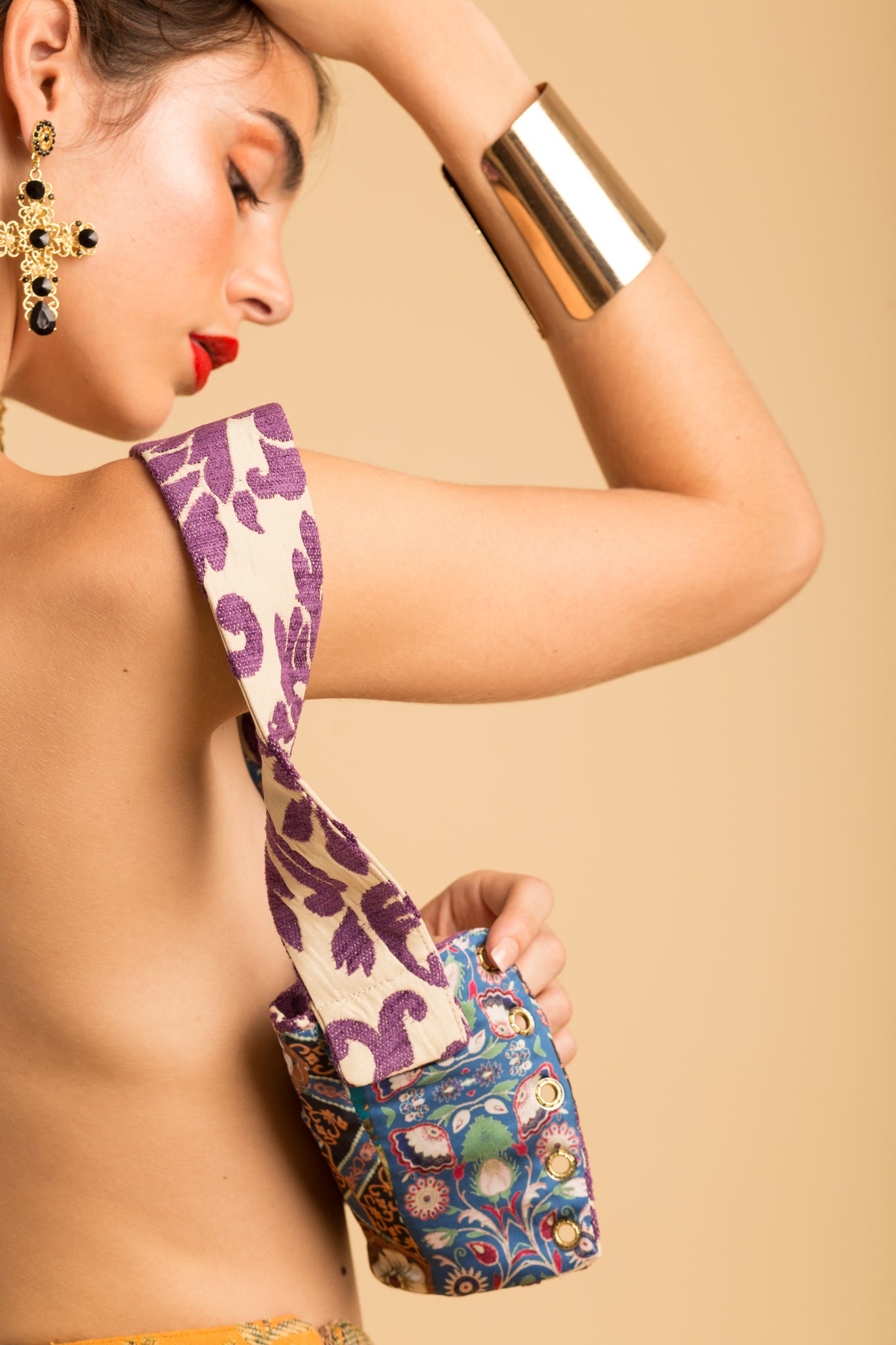Purple and beige tapestry printed heart shape crop top with straps. Features draped detailing and back lace fastening. Lined interior with contrast printed fabric.Body length 17cm / Model tall 1,74cm Wears size S