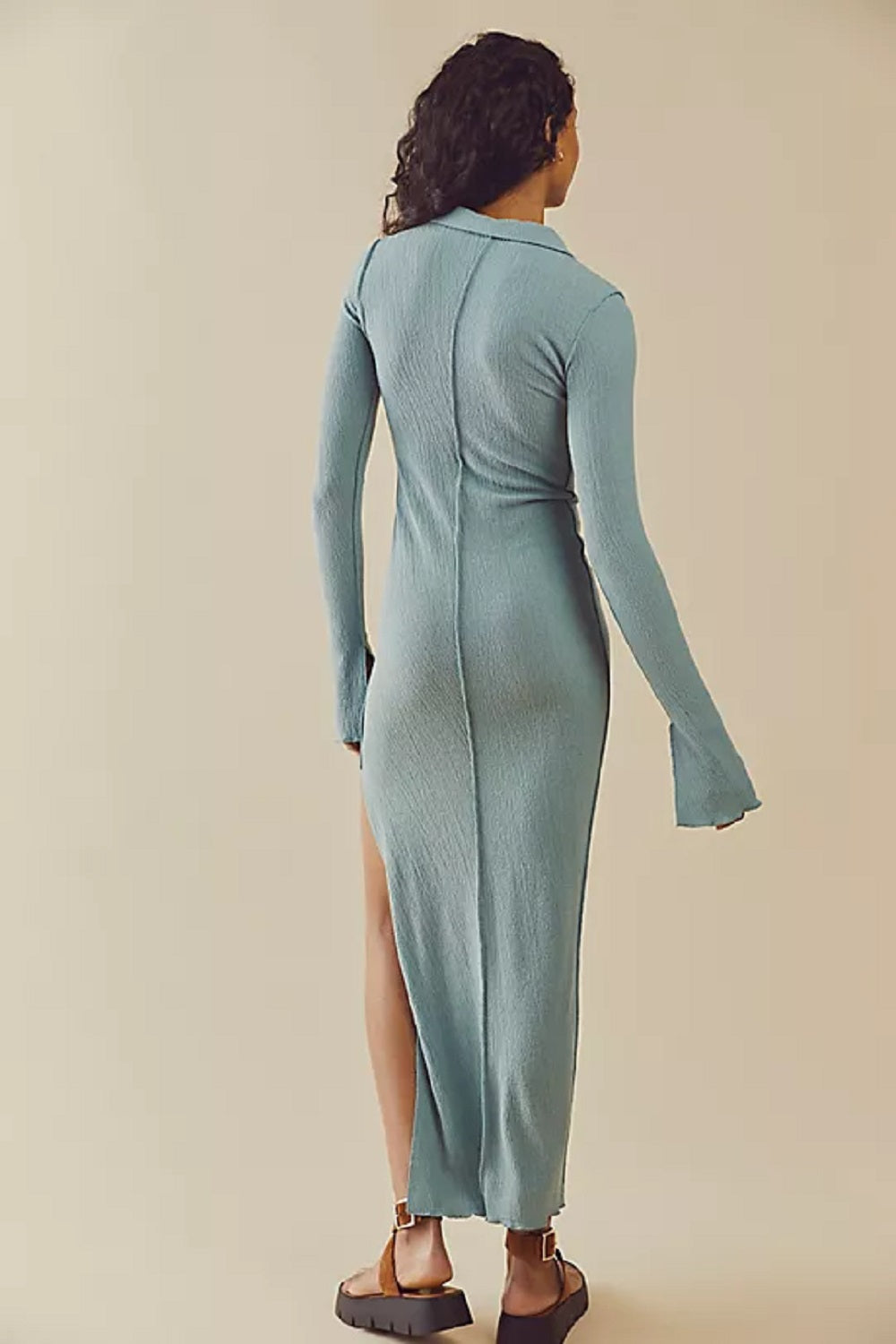 Your new go-to knit maxi dress featured in a fitted silhouette with henley-style neckline, bell sleeves, and exaggerated side slit for added shape.
