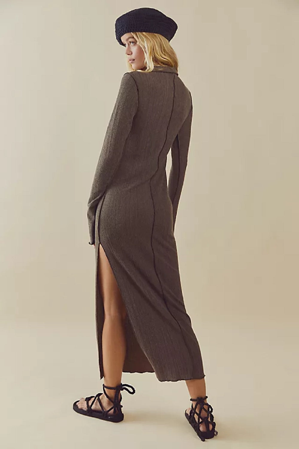Your new go-to knit maxi dress featured in a fitted silhouette with henley-style neckline, bell sleeves, and exaggerated side slit for added shape.