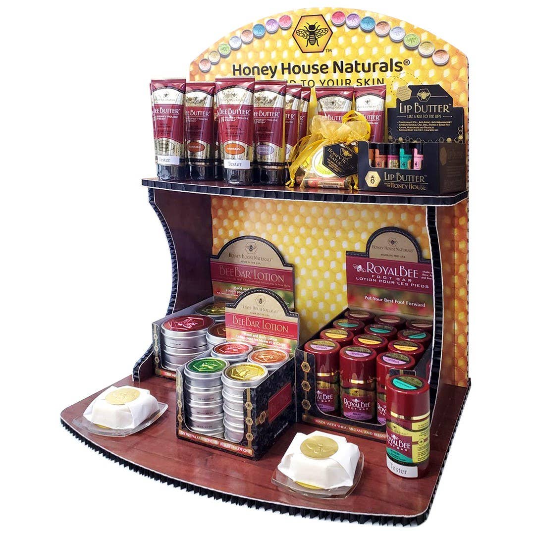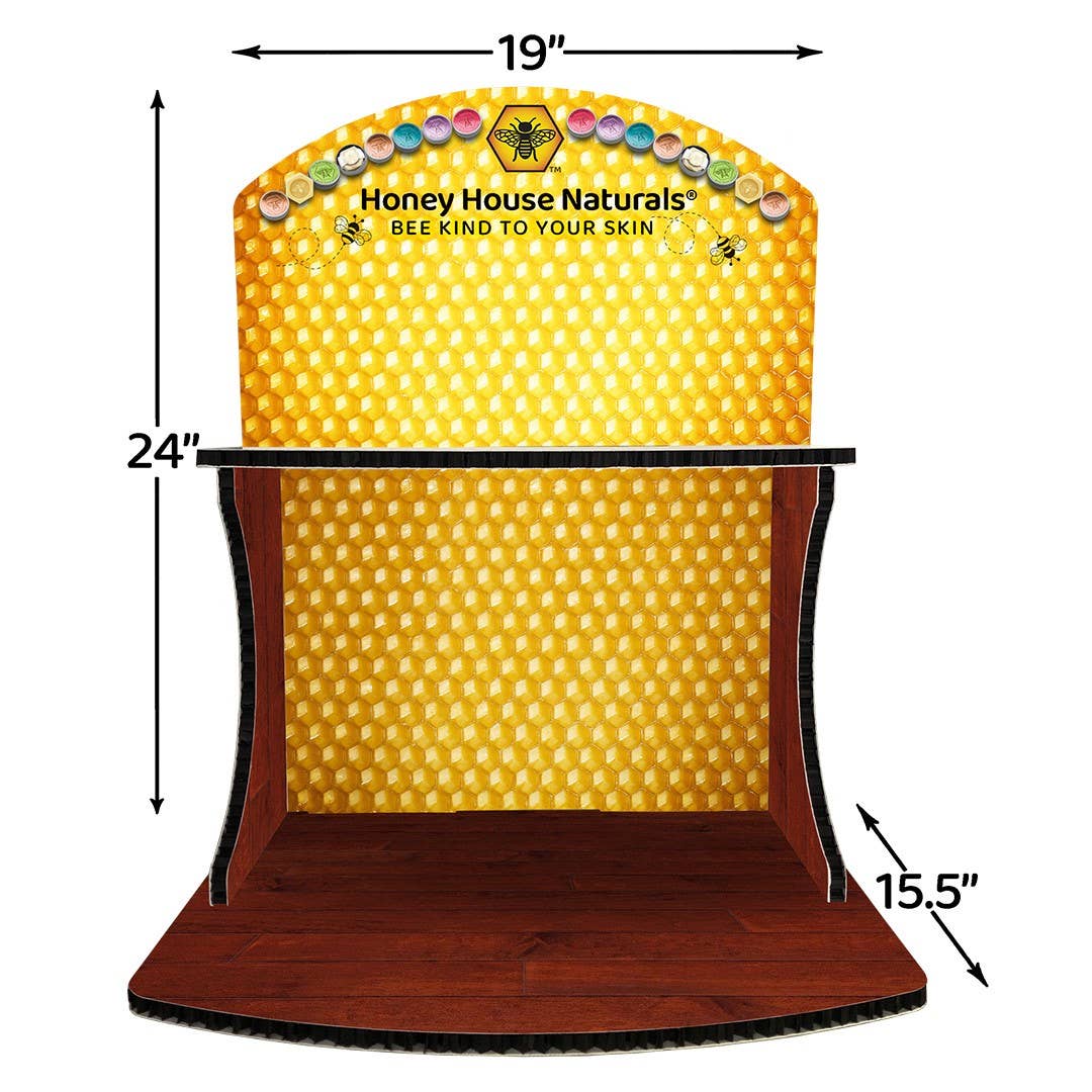 A counter display can draw the eye, organize product and save space. Try our Honey House Counter Display to make a splash on your next display. This is a light, surprisingly durable display made of recycled falcon board - with a bright and colorful color scheme that will have your customers buzzing to the product.