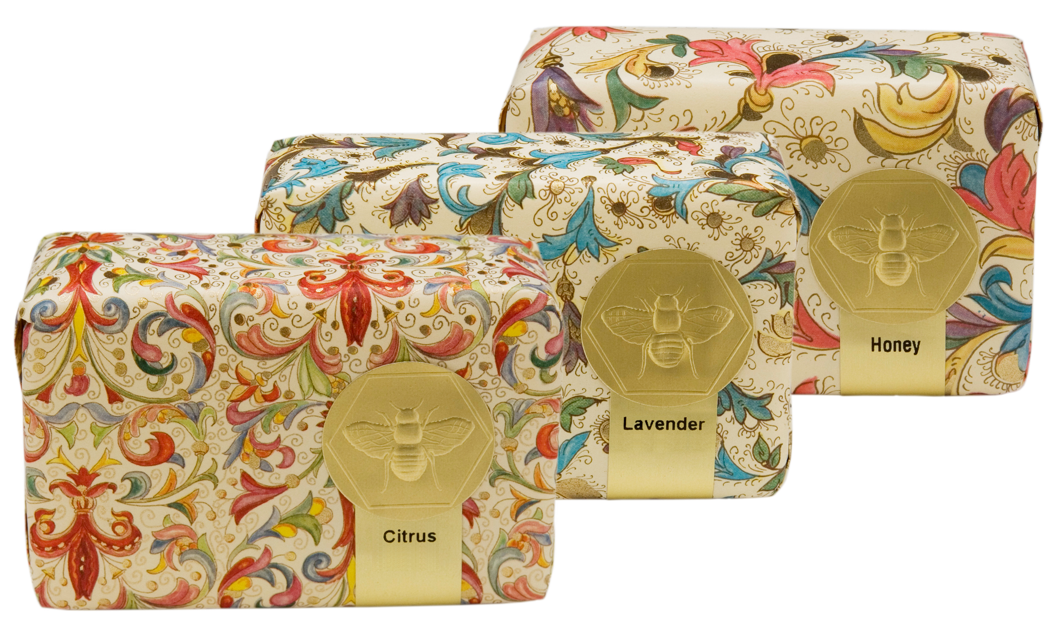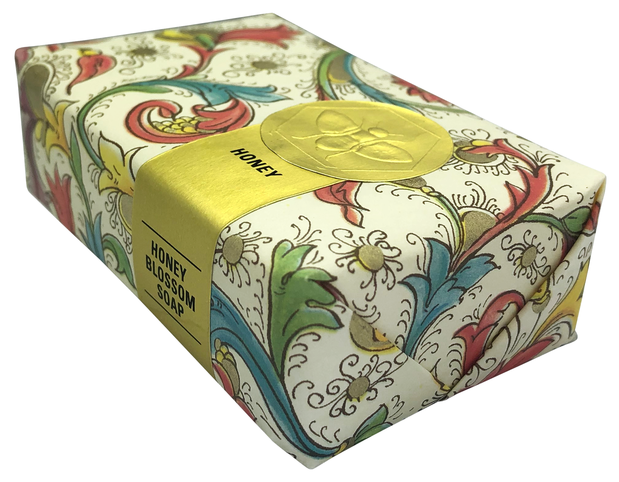 Best Selling Soap in the line, TOP SELLER! Honey Blossom Soap is a natural, high quality, triple milled soap. Shea Butter, Honey, Royal Jelly and Propolis are added to a natural, vegetable base and are pressed into beautifully carved bars. This gentle soap will cleanse, condition and re-hydrate thirsty skin. They are hand wrapped in gorgeous Florentine Paper. This is a great gift!