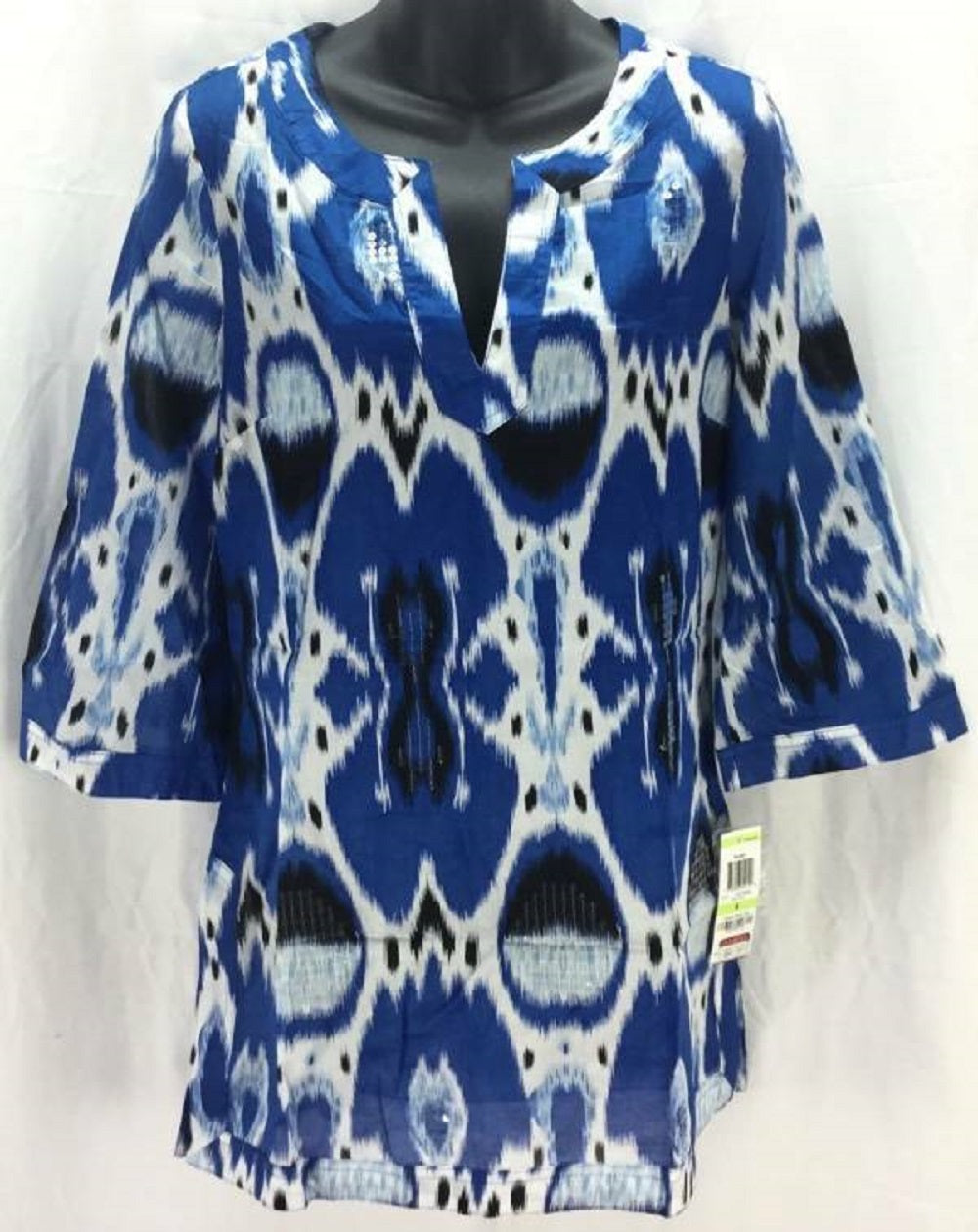 A women's tunic blouse from INC International Concepts. The top is in blue, black, and white with an ikat pattern. The top is in a tunic style, 3/4 sleeves, side slits at hem waist, cotton, v-neckline. The top is machine washable and top is new with tags.