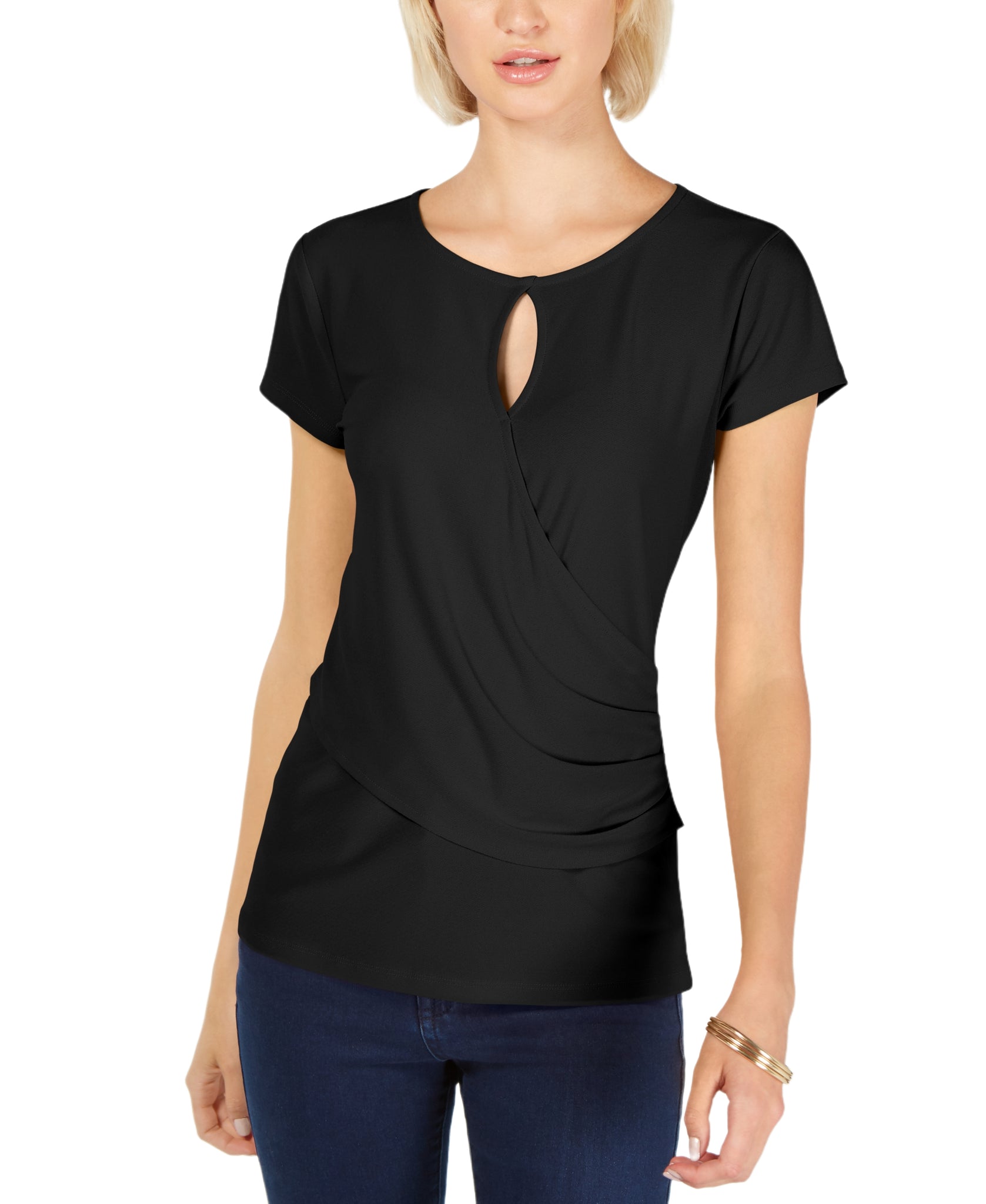 INC Women's Short-Sleeve Keyhole Surplice Top, Deep Black, Large