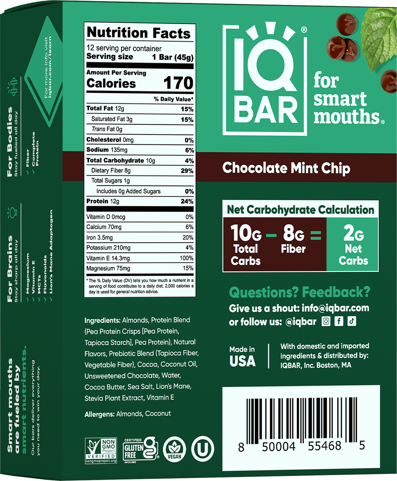Our Chocolate Mint Chip bar is the perfect fusion of rich chocolate and revitalizing mint, complemented by the satisfying crunch of real chocolate chips. Each bar is packed with 12g of plant protein to support your active lifestyle and keep you feeling satisfied throughout your day.