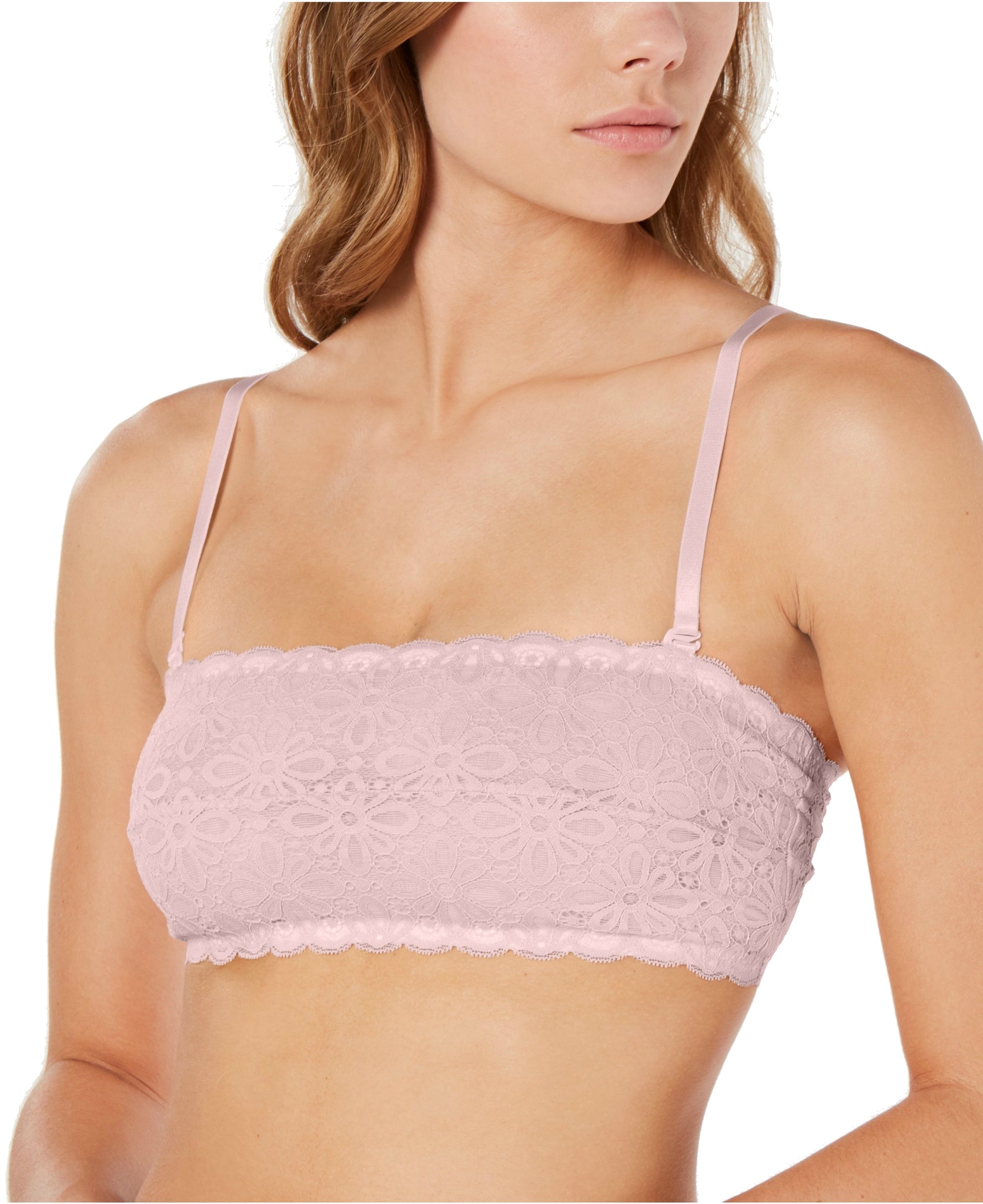 A fresh flower design and scalloped edge accent the pretty lace of this Jenni by Jennifer Moore bandeau bra.