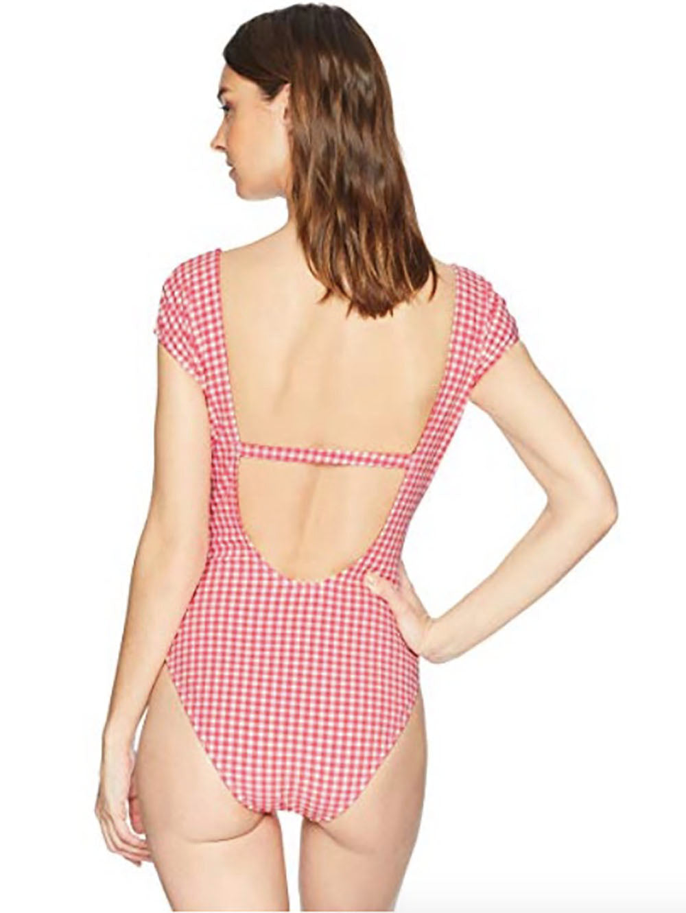 This retro one-piece swimsuit from Jessica Simpson features a peek-a-boo bodice with a bow and cap-s