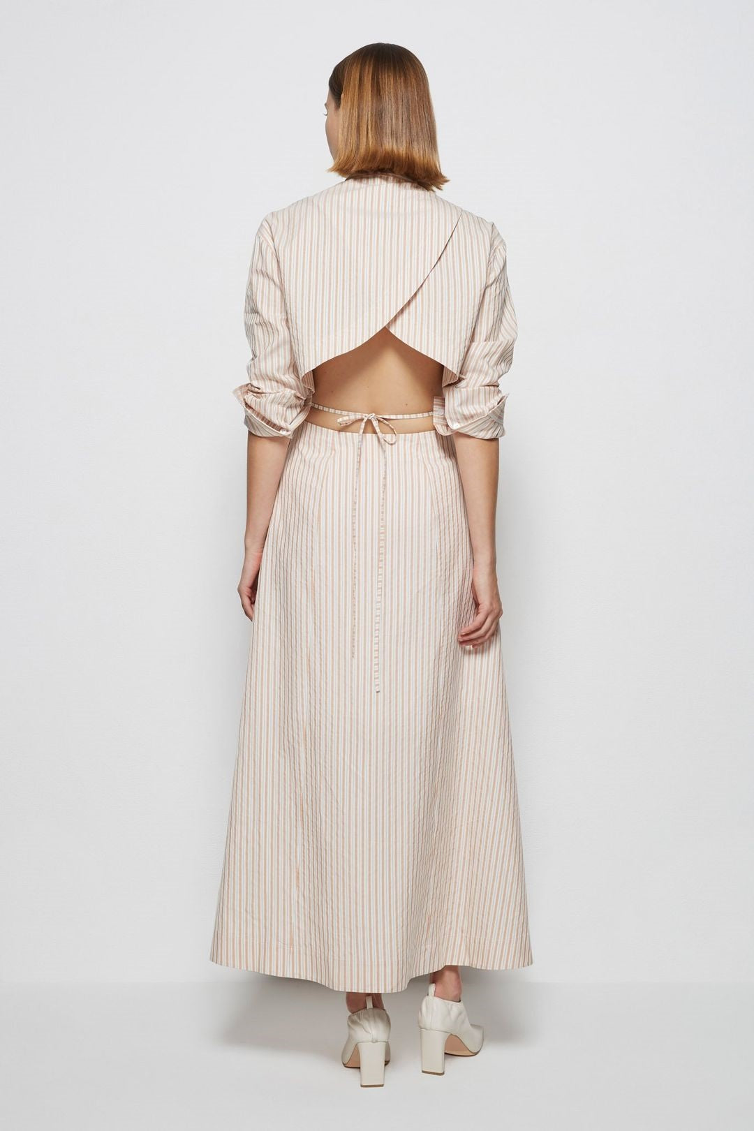 Striped open-back shirtdress featuring a cutout waist with adjustable drawstrings at the back.