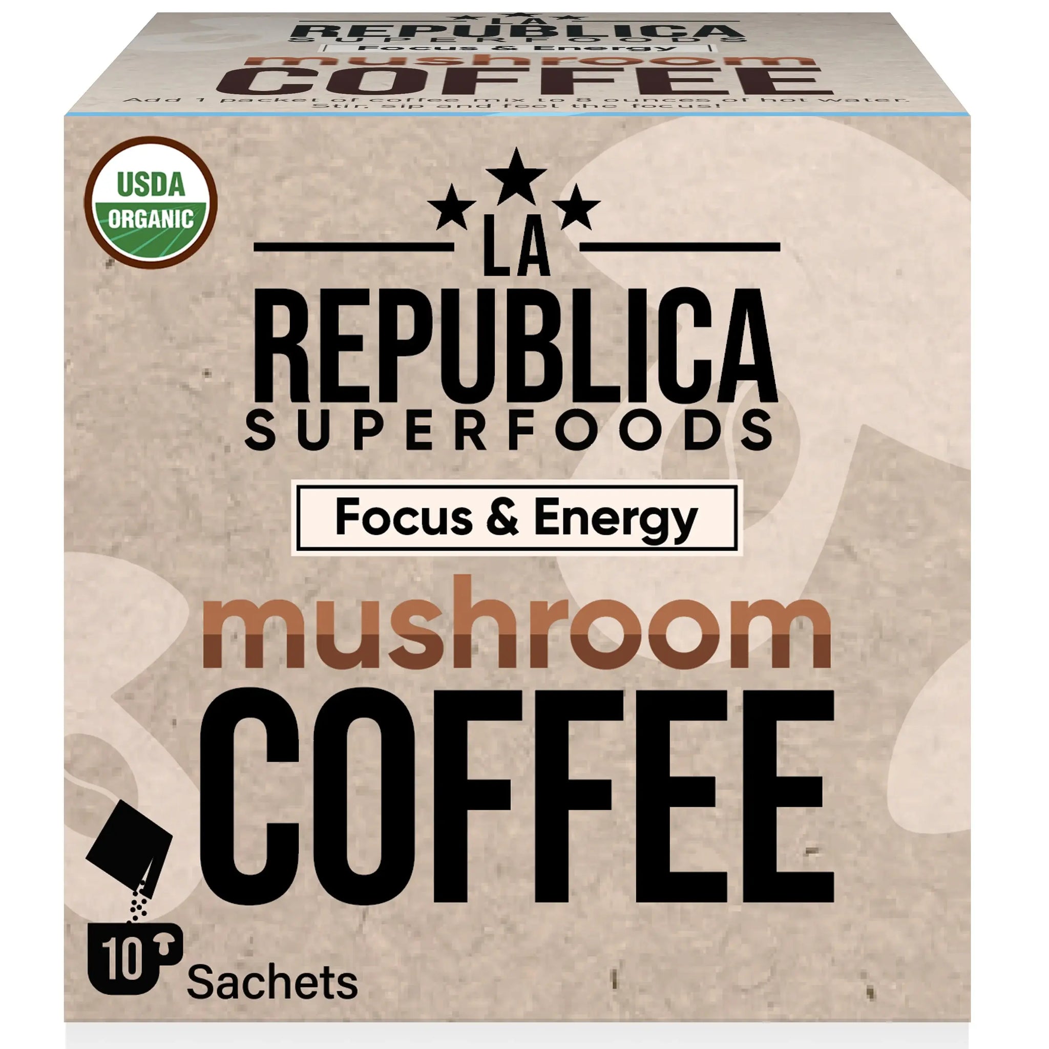 Indulge in the extraordinary with La Republica's USDA Organic Mushroom Coffee, now available in a convenient 10-pack of individual serving packets, each crafted with a captivating blend of seven remarkable mushroom varieties. This innovative concoction combines the finest USDA-certified organic coffee beans and the earthy richness of organic mushrooms, creating a coffee experience that transcends the ordinary.