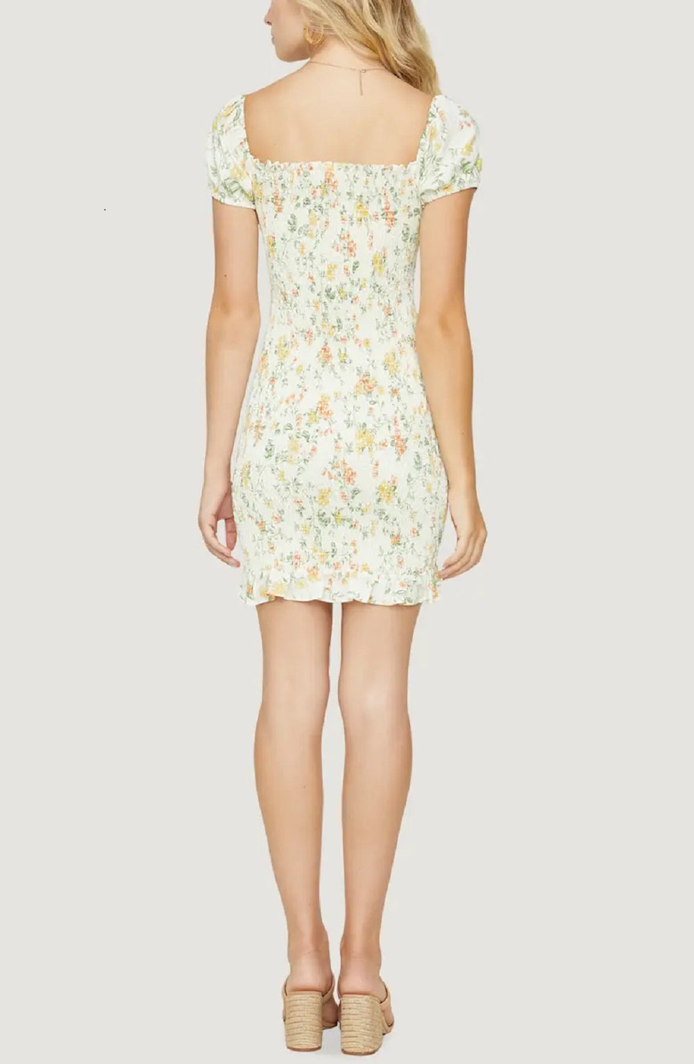 Ditsy blooms in sunbaked hues brighten a figure-skimming smocked minidress styled with a square neck and puff sleeves that are perfect for summery days.