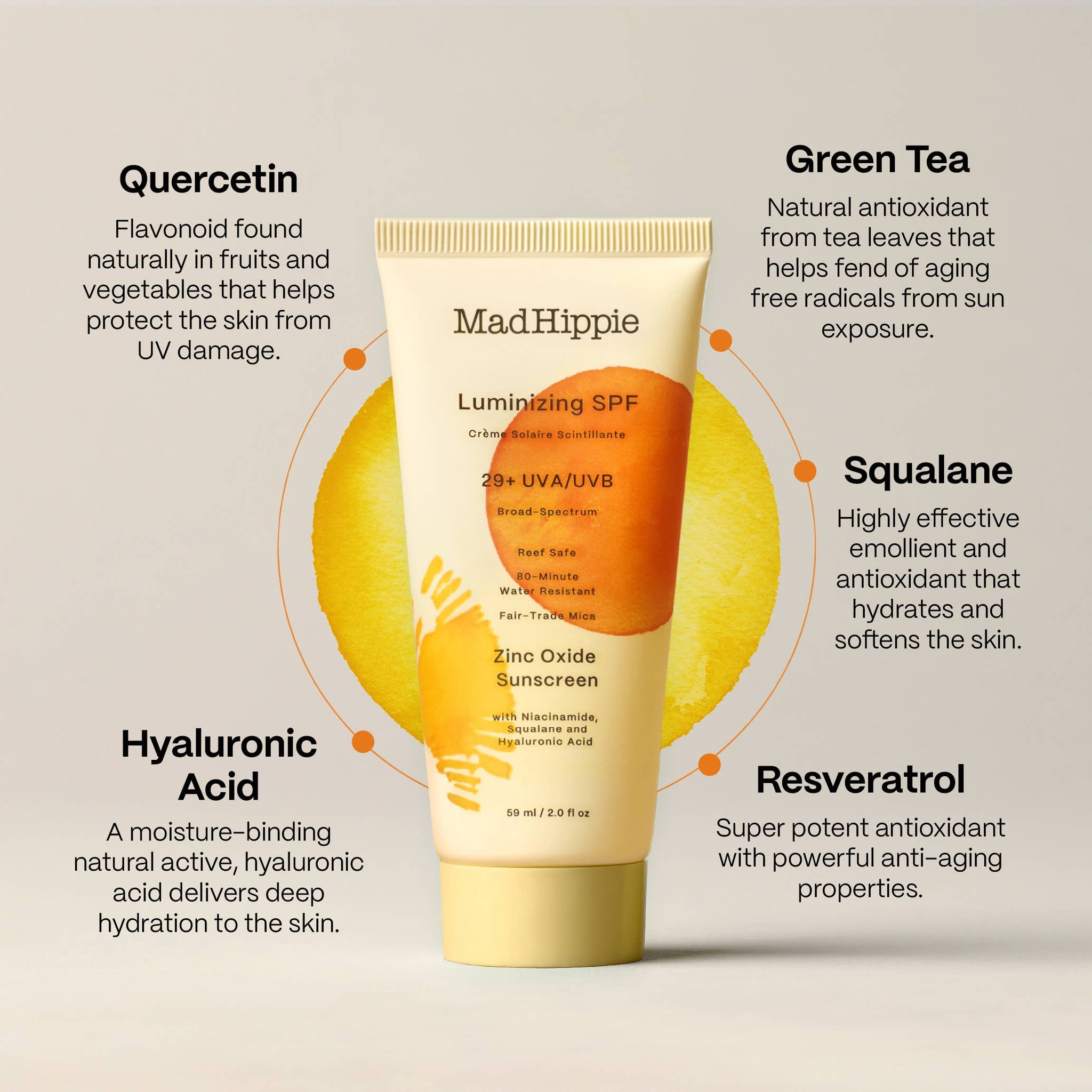 A slightly shimmery, lightweight clear zinc sunscreen with fair-trade mica & an antioxidant boost! For a clean, effortless glow...with an SPF 29+ rating & 80-min water resistance!
