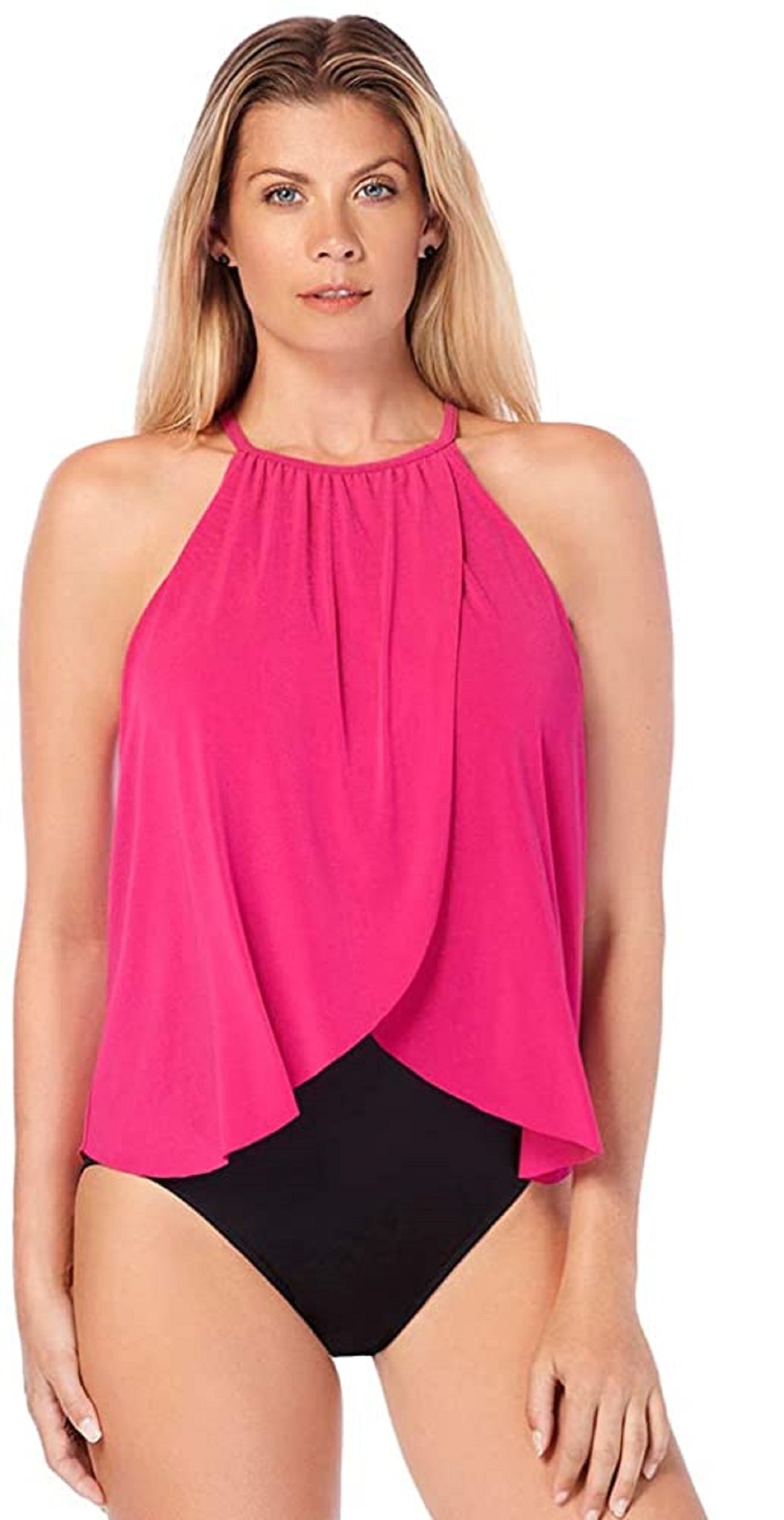 A chic drape accents a sleek halter neckline, bringing flattering coverage to this one-piece swimsuit from Magicsuit.