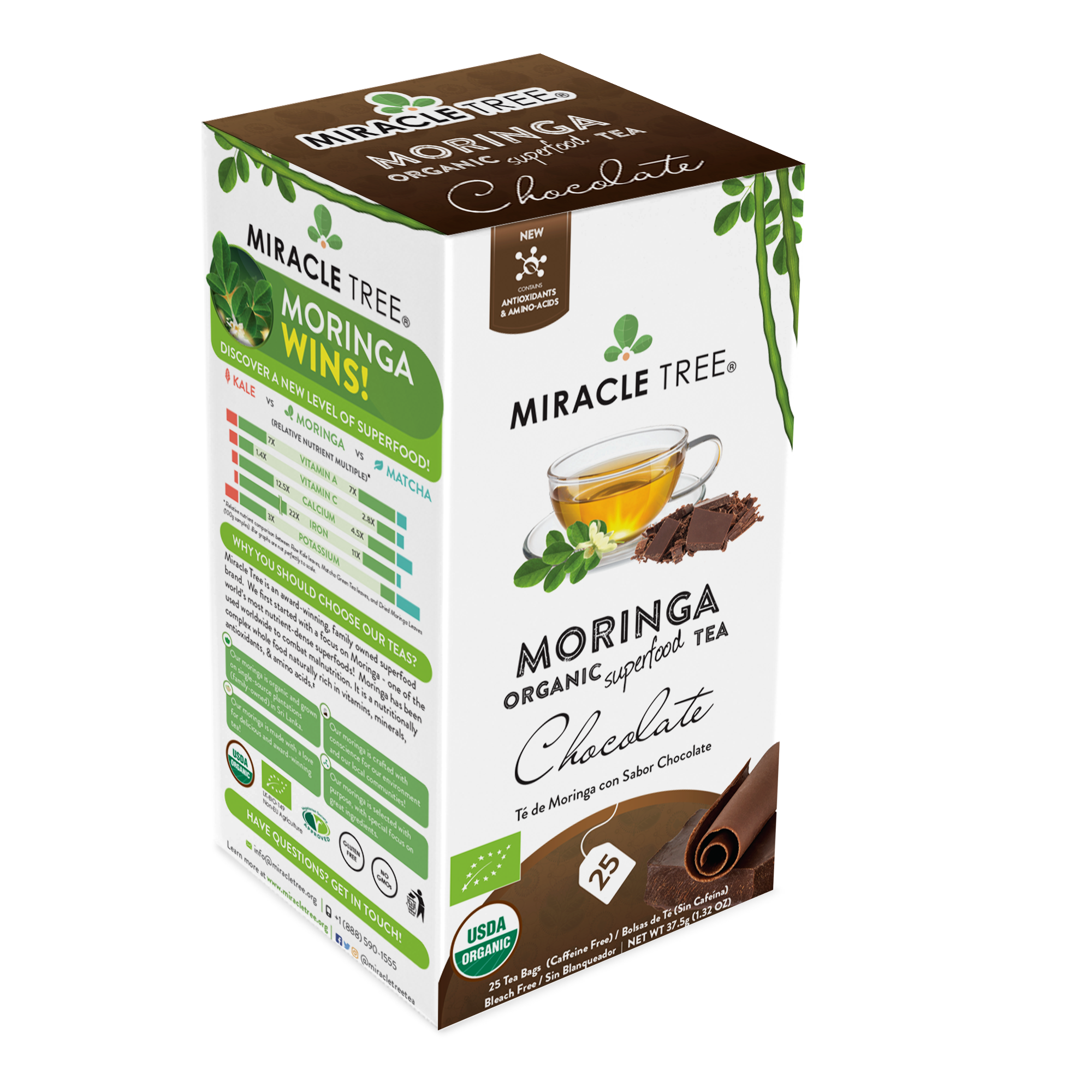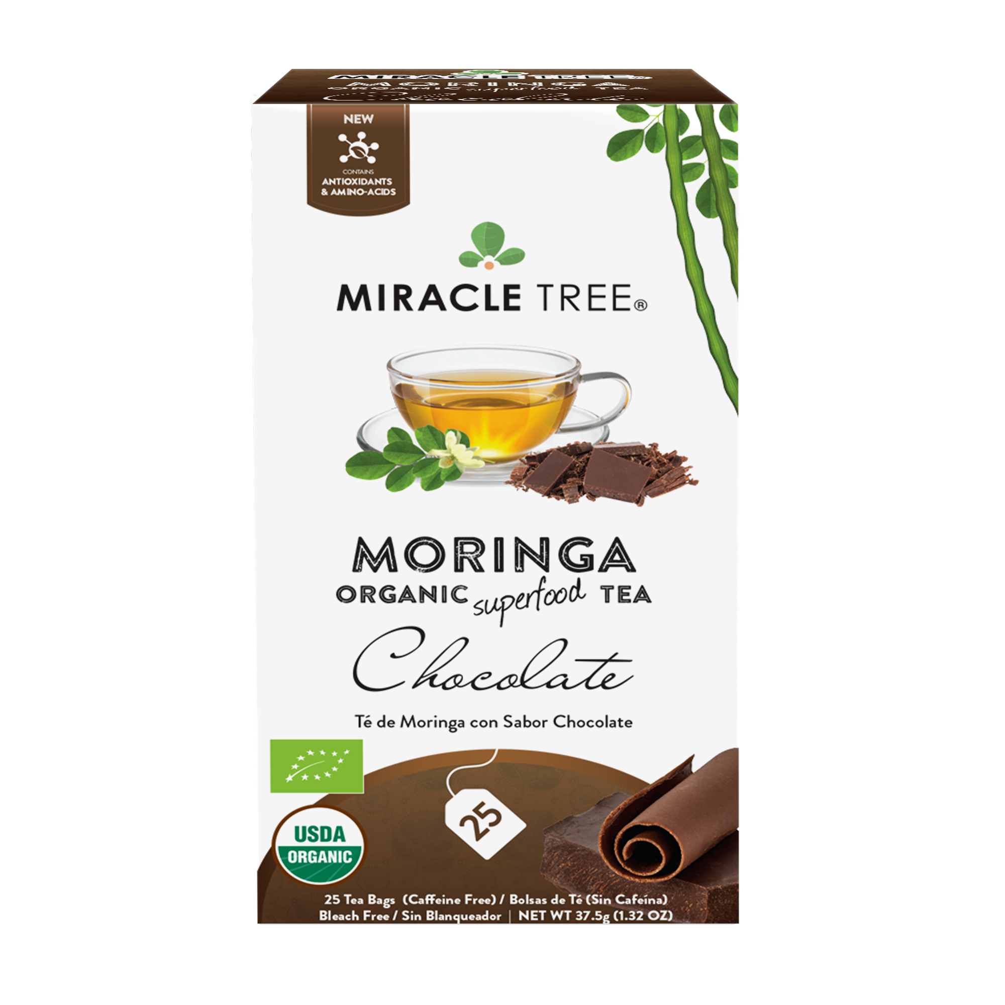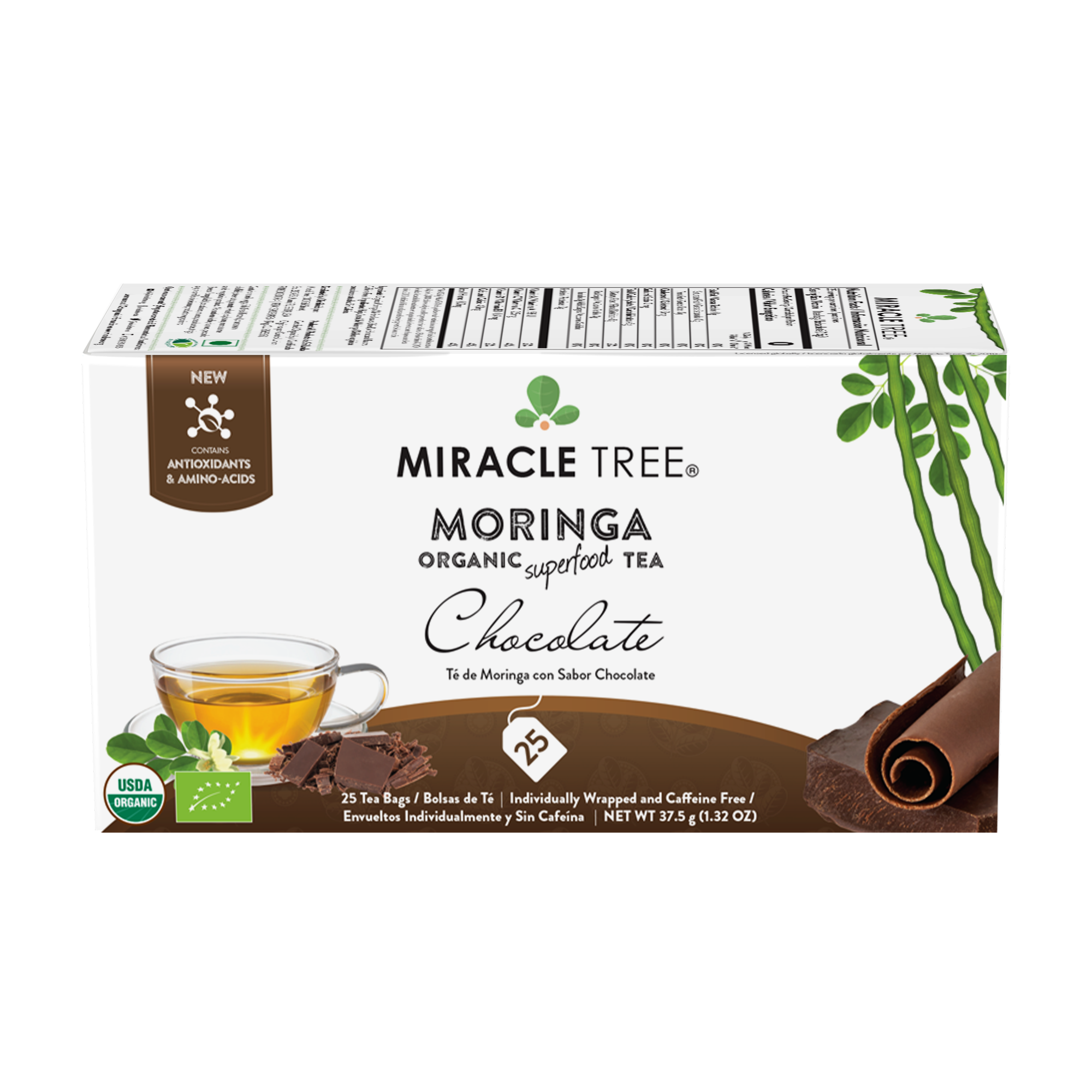 Miracle Tree's Chocolate & Organic Moringa Superfood Tea is brand new infusion which results in a velvety and smooth chocolate taste and moringa's nutrients.