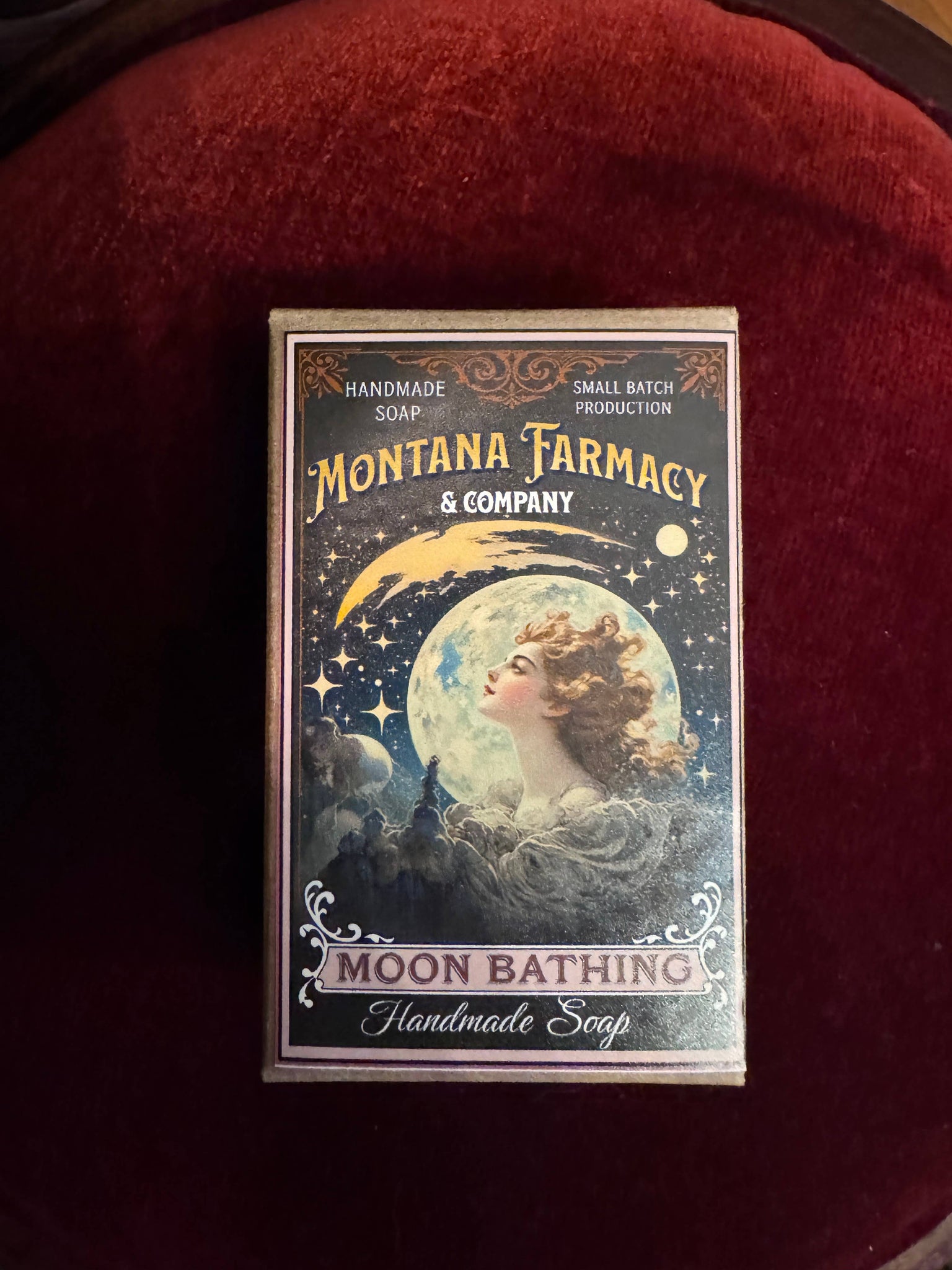 Scrumptious lathering soap made with the finest all natural ingredients. This soap is made the old fashioned way, slow and steady. our soaps make great gifts but are also superb for every day use for you and your family. NO fragrance oils! Idaho, Montana, Wyoming. Moon theme, art nouveau in style Great for florists, in a gift basket as a get well gift or just because Baby, newborn, wedding, bridal party, bachelorette gifts. Baby shower, bridal shower, great in general stores, olde tyme, gift shops and so much more.