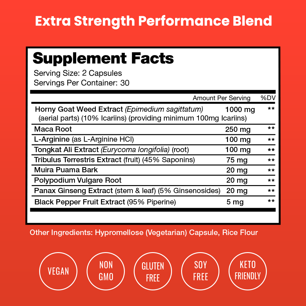 With over 100mg of the active ingredient called icariins per serving, you get a fully loaded, premium horny goat weed that makes other products seem a tad limp. Our powerhouse blend includes maca, tribulus, tongkat ali, l-arginine & premium korean ginseng with a 5% ginsenoside content. Adding black pepper extract to the blend maximizes absorption so you can achieve better results than a traditional horny goat weed supplement.