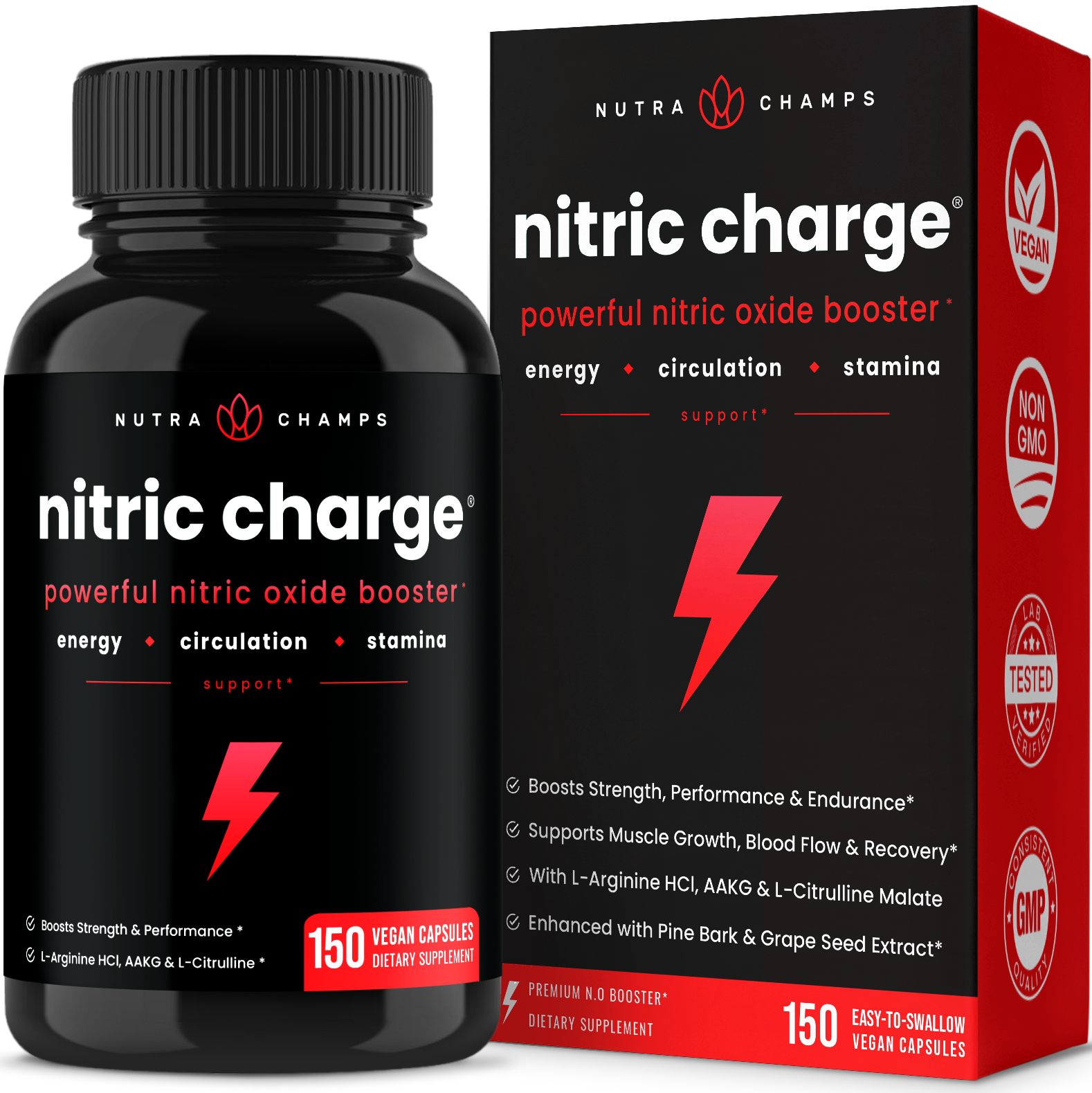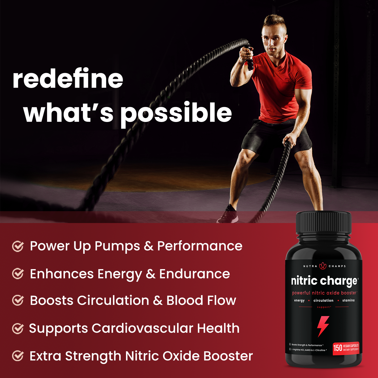 Whether you’re a weightlifter, athlete, or just looking to reach your personal goals, Nitric Charge will make explosive workouts your new norm. Dramatically enhance overall performance by promoting oxygen delivery to your muscles and improving your muscle building capacity. Jam packed with essential nitric oxide boosters, L-Arginine and L-Citrulline, Nitric Charge can deliver better bang for your buck and better payoffs for your pump. Redefine what’s possible and experience a true Nitric Charge.