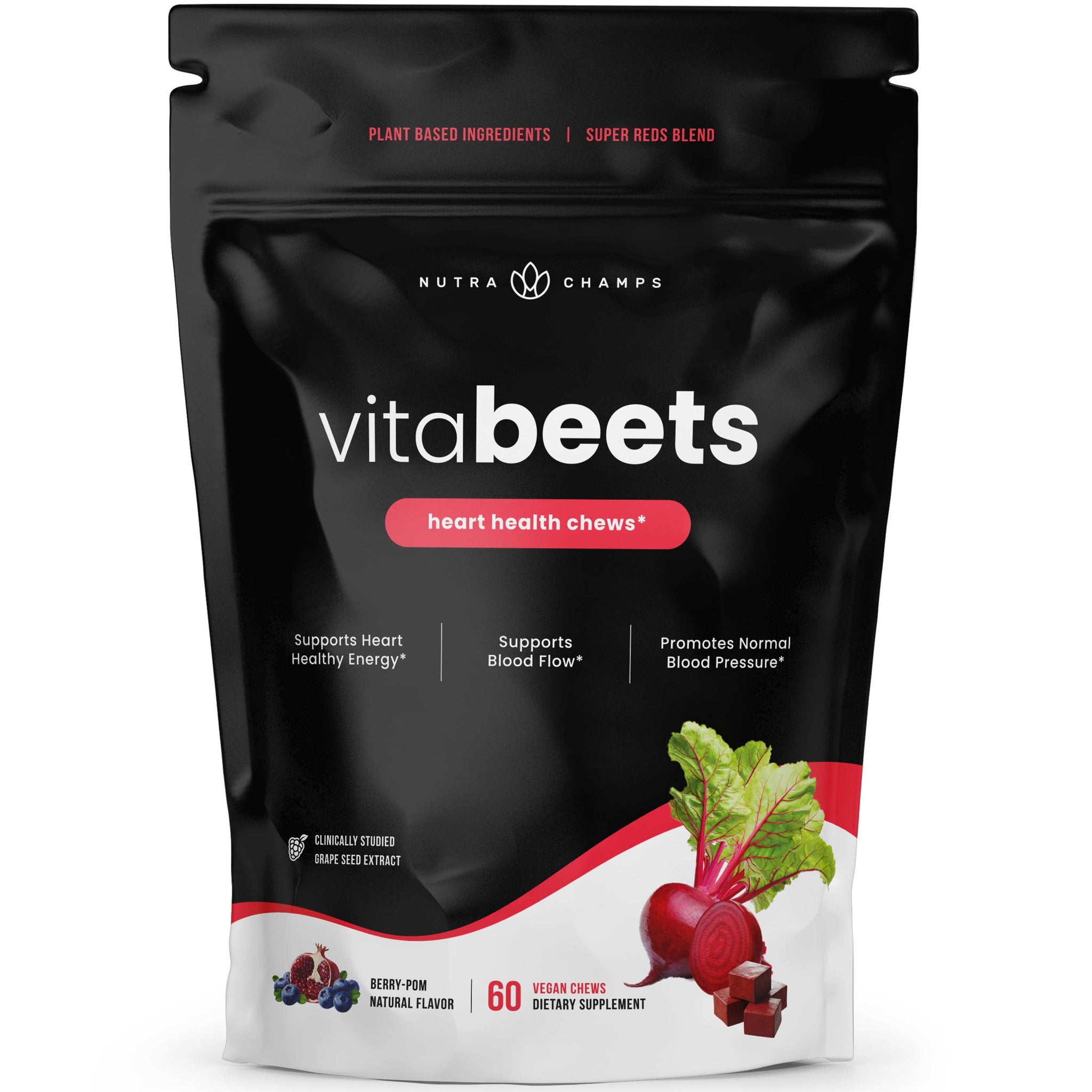 VitaBeets elevate your daily wellness routine with beetroot, clinically-researched grape seed extract and more nutritious super reds! Enjoy an explosion of flavour in every chew while helping nurture your heart health, boost energy levels, and support healthy circulation as part of a healthy lifestyle.