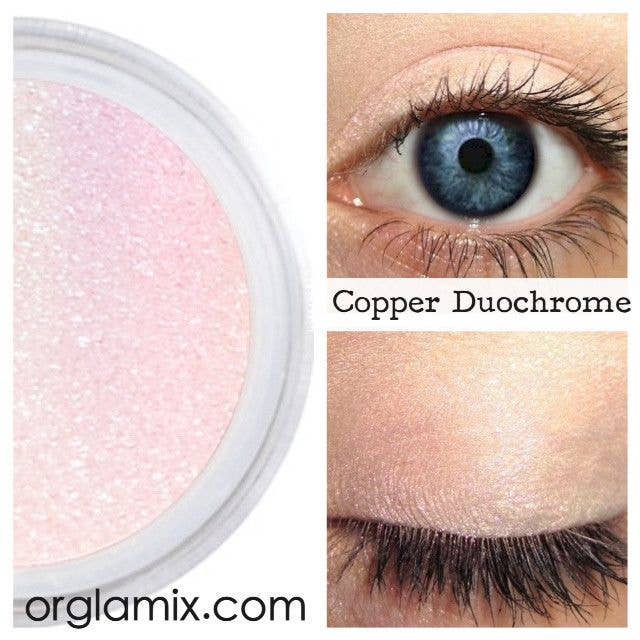 An innovative eyeshadow with a chameleon-like, color-shifting shade in an exclusive all natural formula. Copper Duochrome Eyeshadow glides on white with a with a copper color shifting duochrome finish.