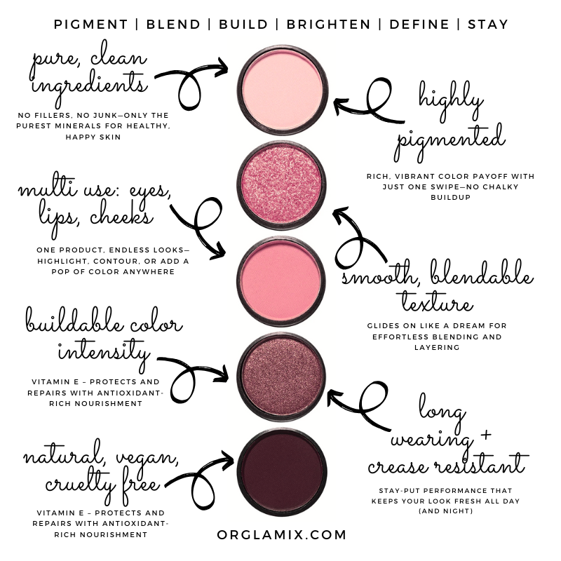 Pure mineral pigments fused with light-reflecting mica add shimmer to eyes, lips, cheeks, or any area for an eye-catching effect.