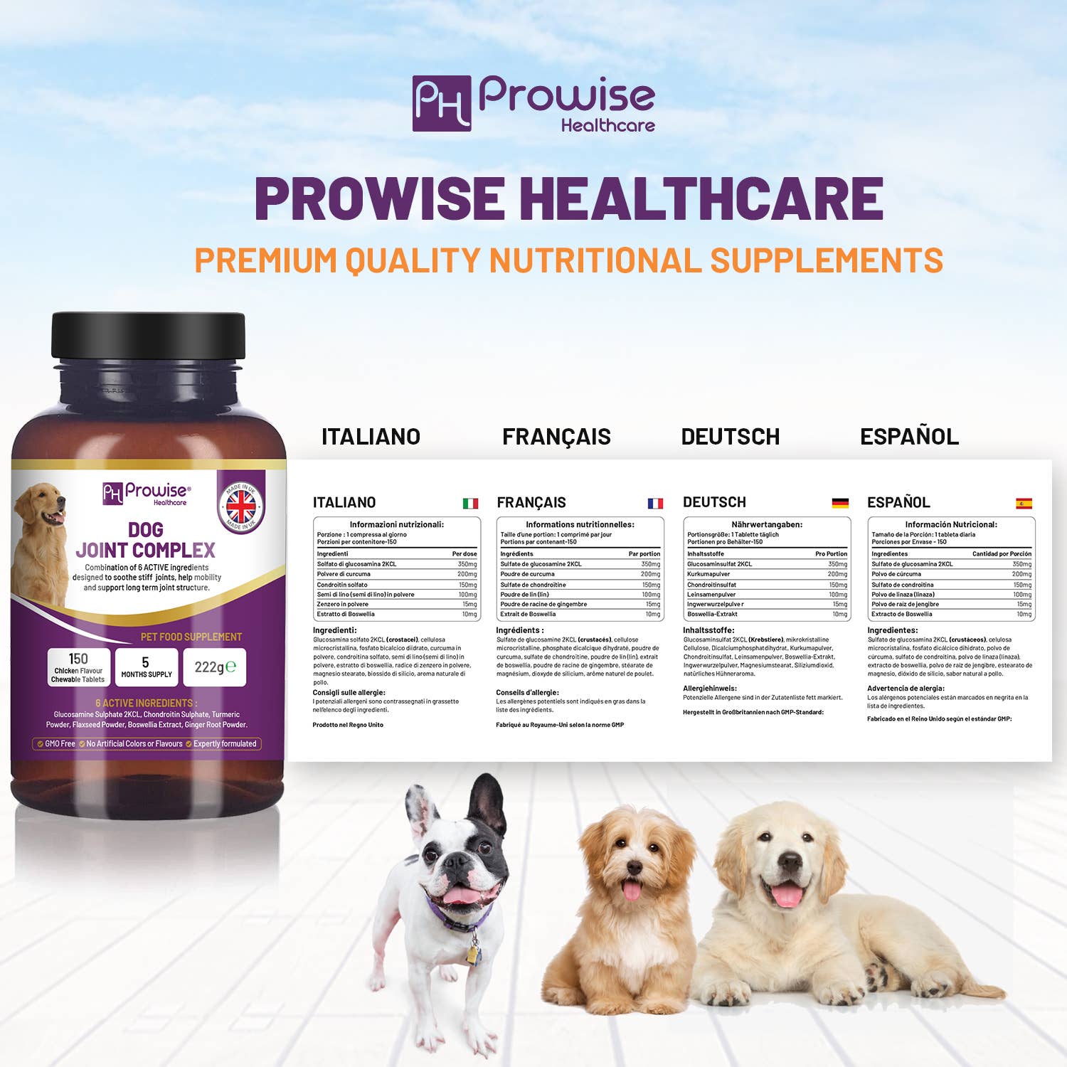 Why Buy Prowise Best Dog Joint Supplement? The powerful 6 Active proven ingredients for dog joint supplements Powerful blend of ingredients known to support the health of dog joints, improve mobility and ease discomfort 150 Tasty Flavor tablets 5 Months of supply base of minimum dosage GMO Free Made in UK to GMP Standards Benefits: 👉 Why Buy Prowise Best Dog Joint Supplement - Powerful blend of ingredients known to support the health of dog joints, improve mobility and ease discomfort. The powerful 6 Active proven ingredients for dog joint supplements including Glucosamine sulphate 2KCL, Turmeric Powder, Chondroitin Sulphate, Flaxseed Powder, Ginger Root Powder Bosewilla Extract.