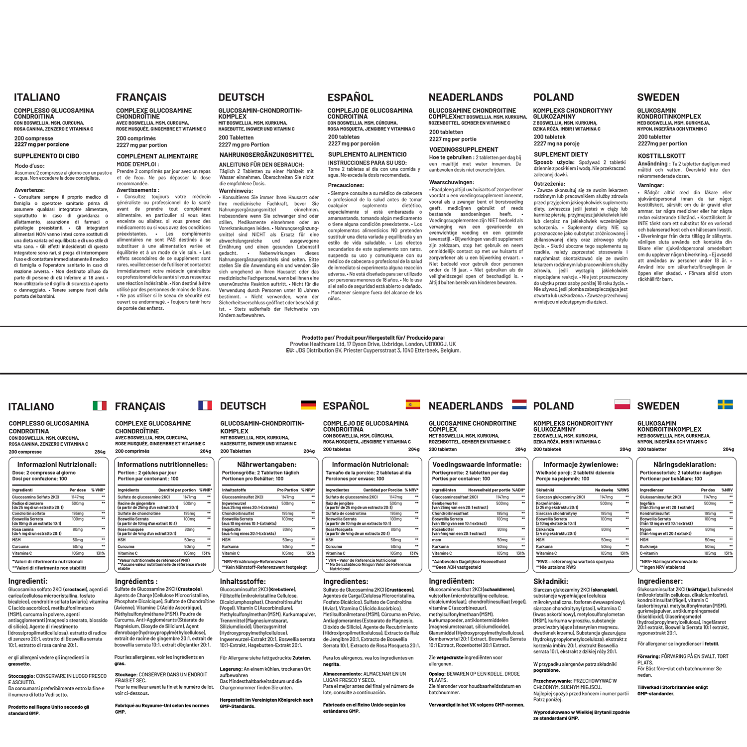 WHAT SETS PROWISE'S GLUCOSAMINE & CHONDROITIN COMPLEX APART? Each serving of our supplement provides a generous amount of 1147mg Glucosamine Sulphate and 195mg Chondroitin Sulphate. Additionally, we have enriched our formula with MSM, Boswellia, Vitamin C, Turmeric, Ginger Root, and Rosehip to enhance the benefits.