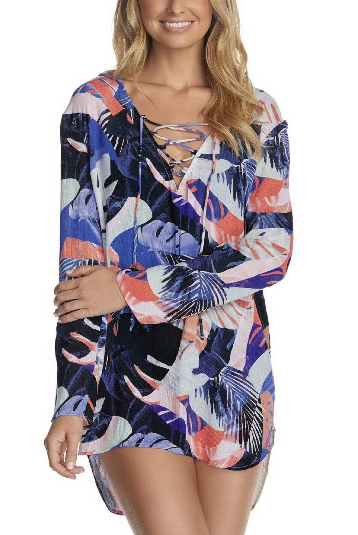 Top off your swim style with this colorful cover-up from Raisins, a vibrant jungle-inspired printed piece accented with a modern high-low hem, attached hood and a lace-up neckline.