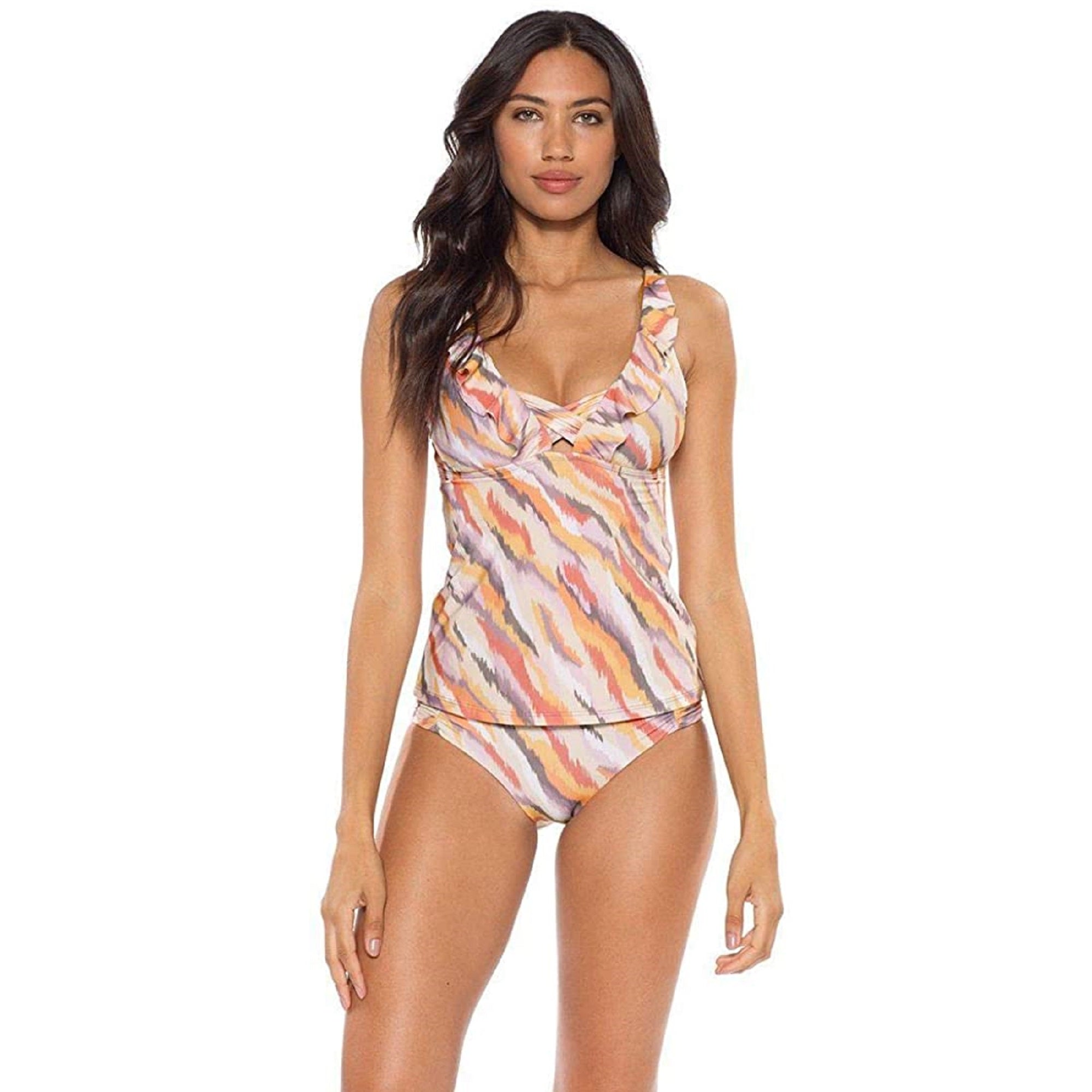 A playful look with a front ruffle and a cool abstract print, this tankini top from So Luna elevates your beach babe style.