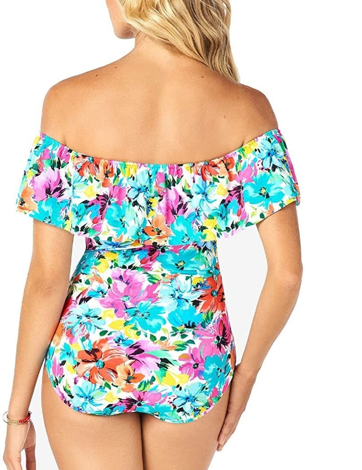 Go for gorgeous in this vibrant one-piece swimsuit from Swim Solutions, styled to show off your shoulders with a ruffled off-the-shoulder neckline.