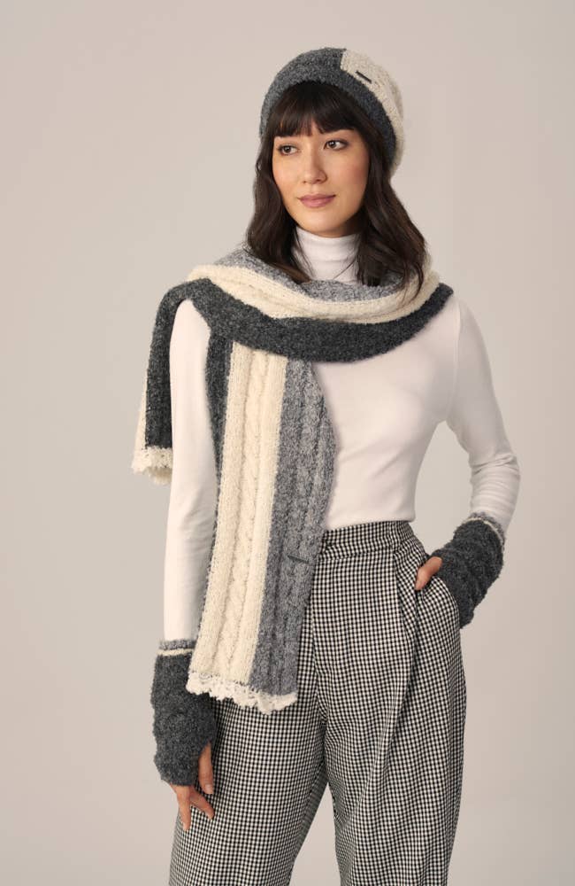 - Knitted alpaca scarf in beige and gray - Made of ultra-soft, boucle alpaca fiber - Block style design - Hypoallergenic & Organic -Part of a matching set: Alma Alpaca Scarf & Alma Alpaca Hat 89% Alpaca 11% Polyamide Dry Clean Recommended Certified Fair Trade Sustainably Grazed